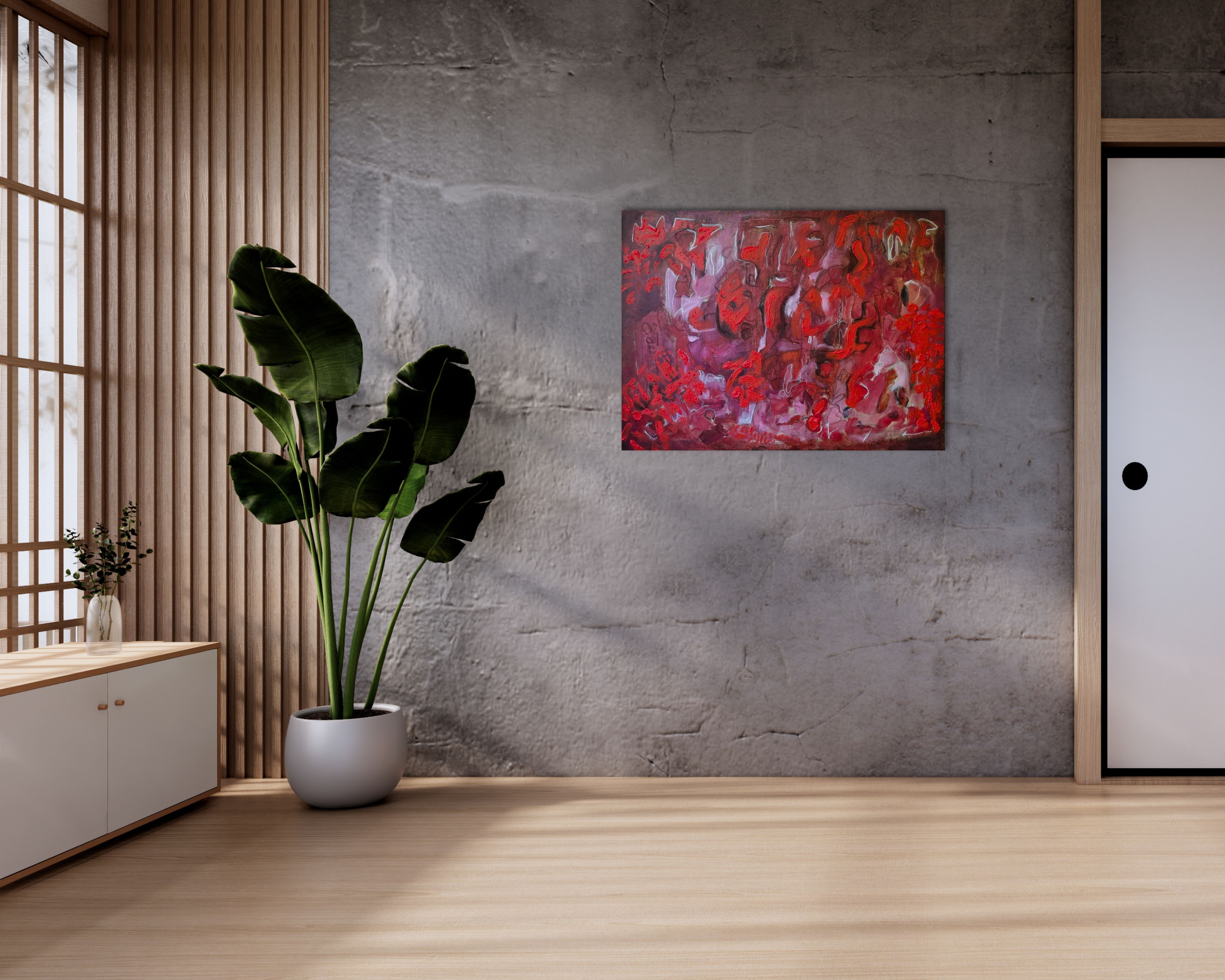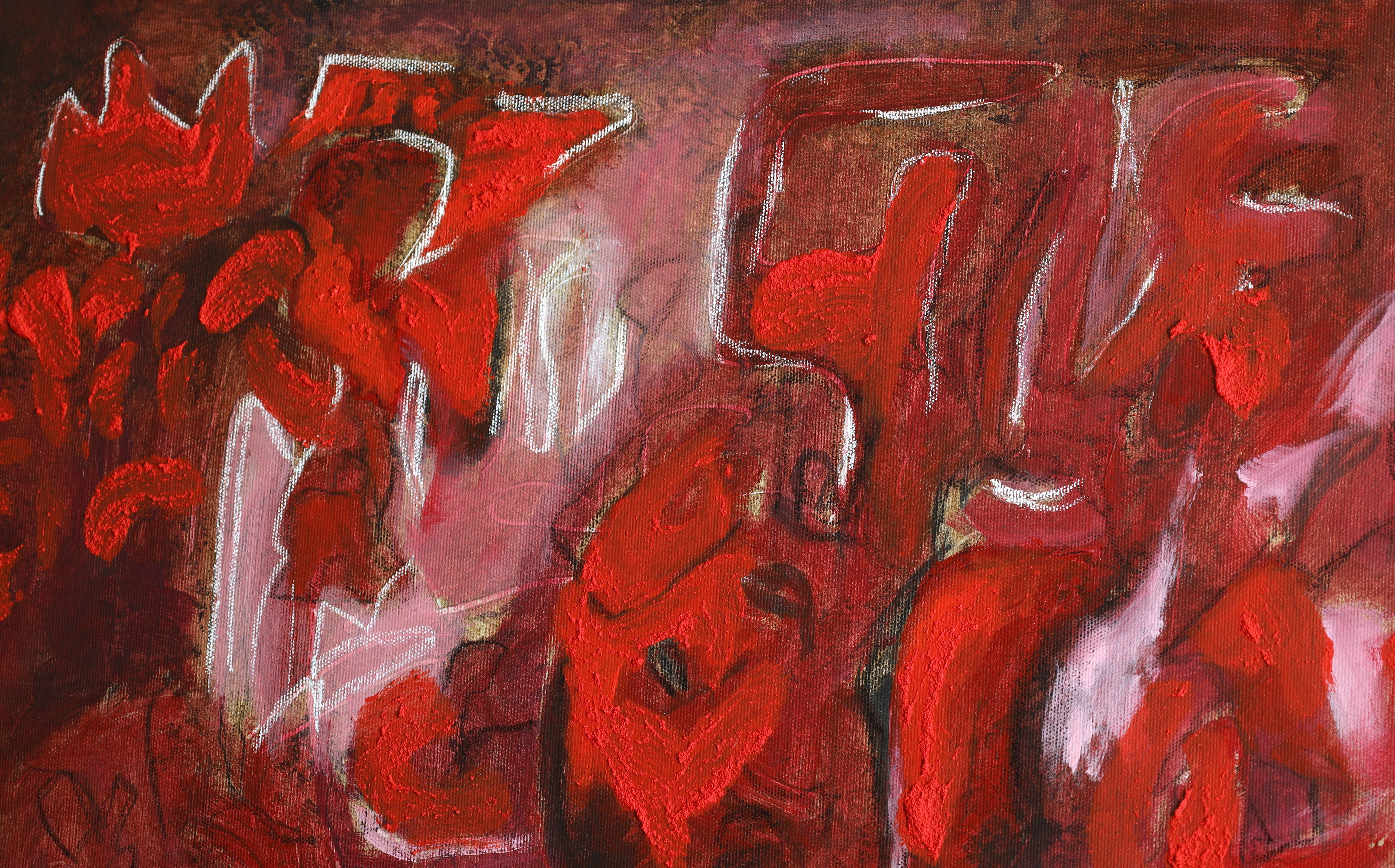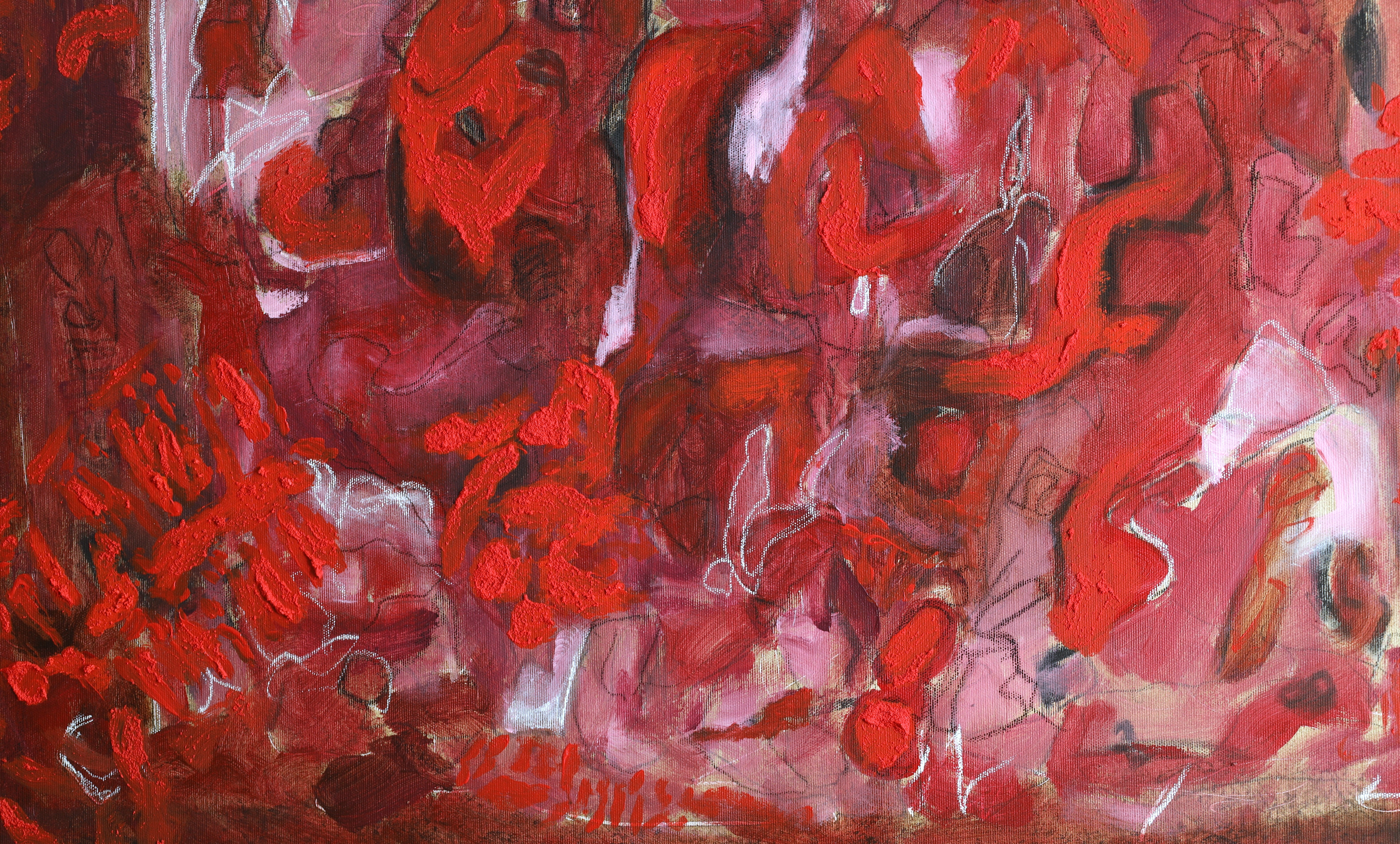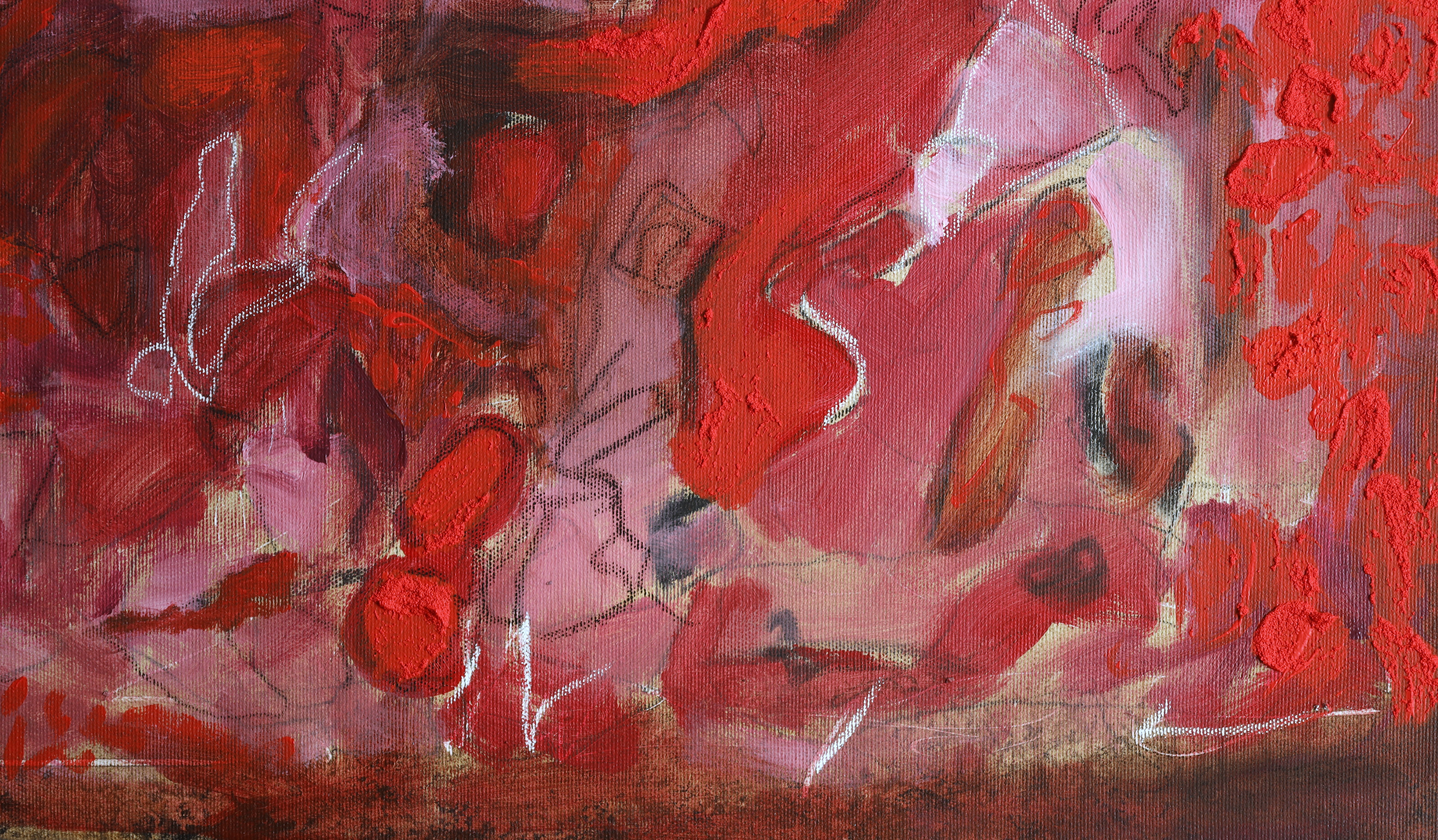 Obraz wykonany żywymi barwami - wieloma odcieniami czerwieni, różu, bieli.