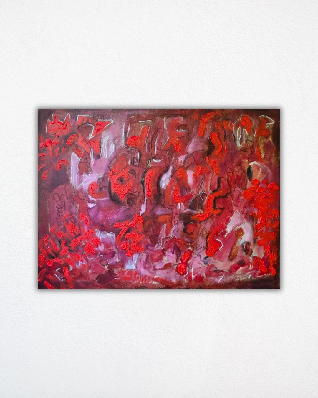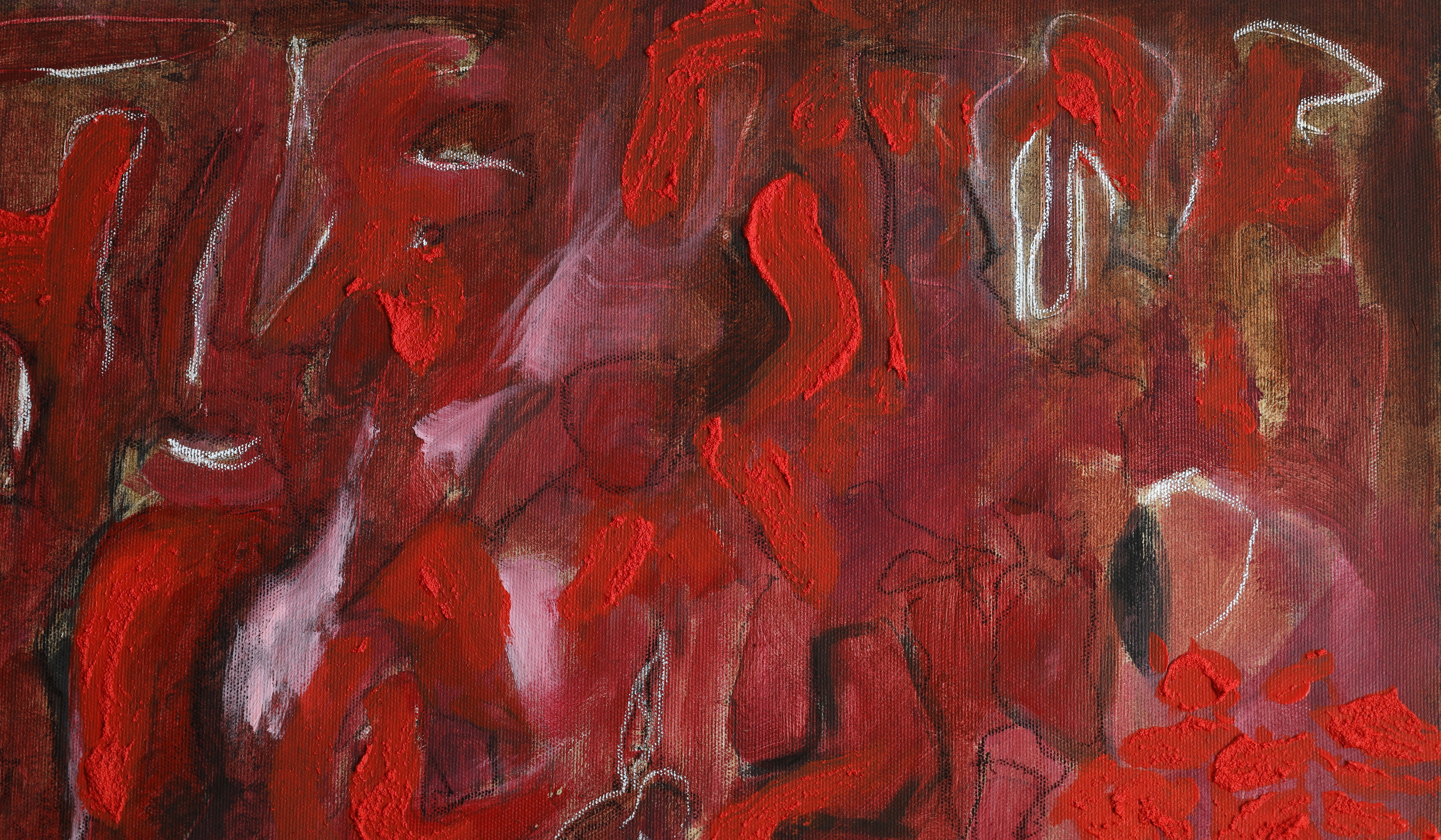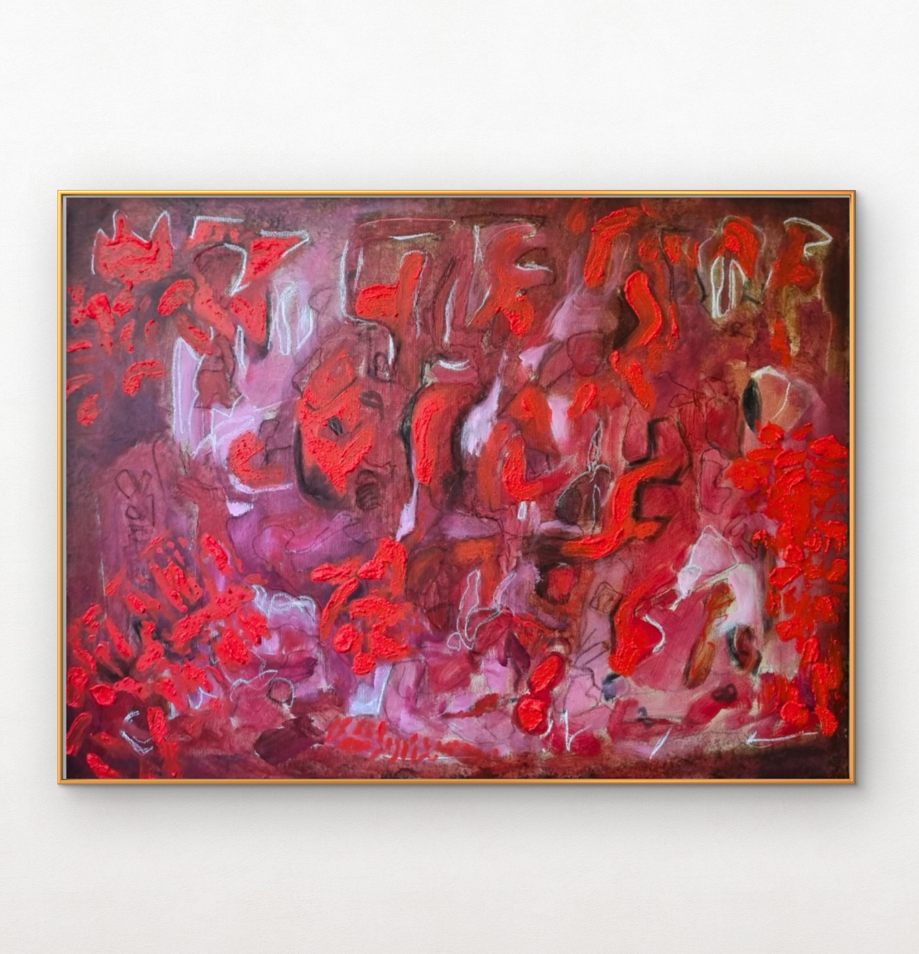 Obraz wykonany żywymi barwami - wieloma odcieniami czerwieni, różu, bieli.