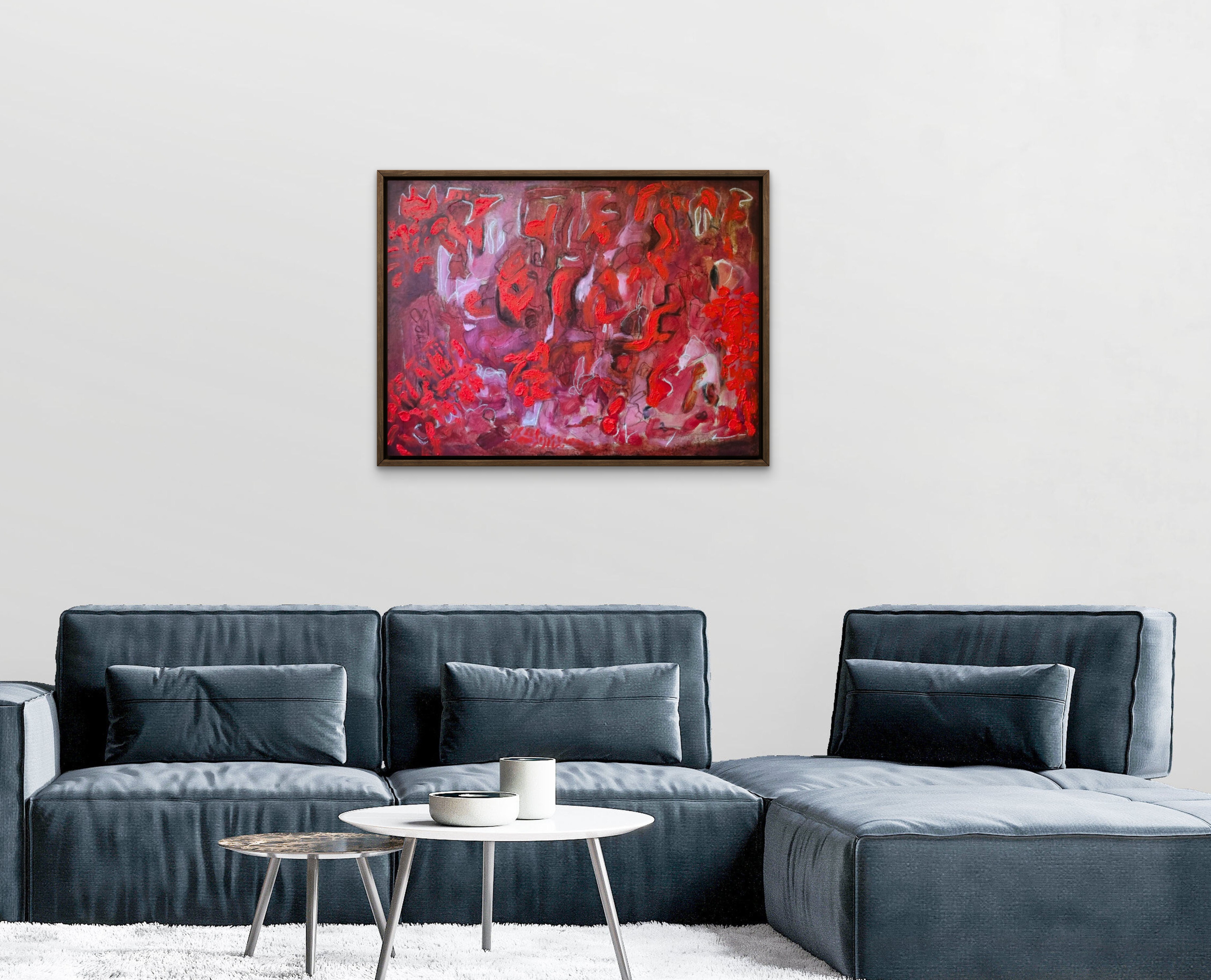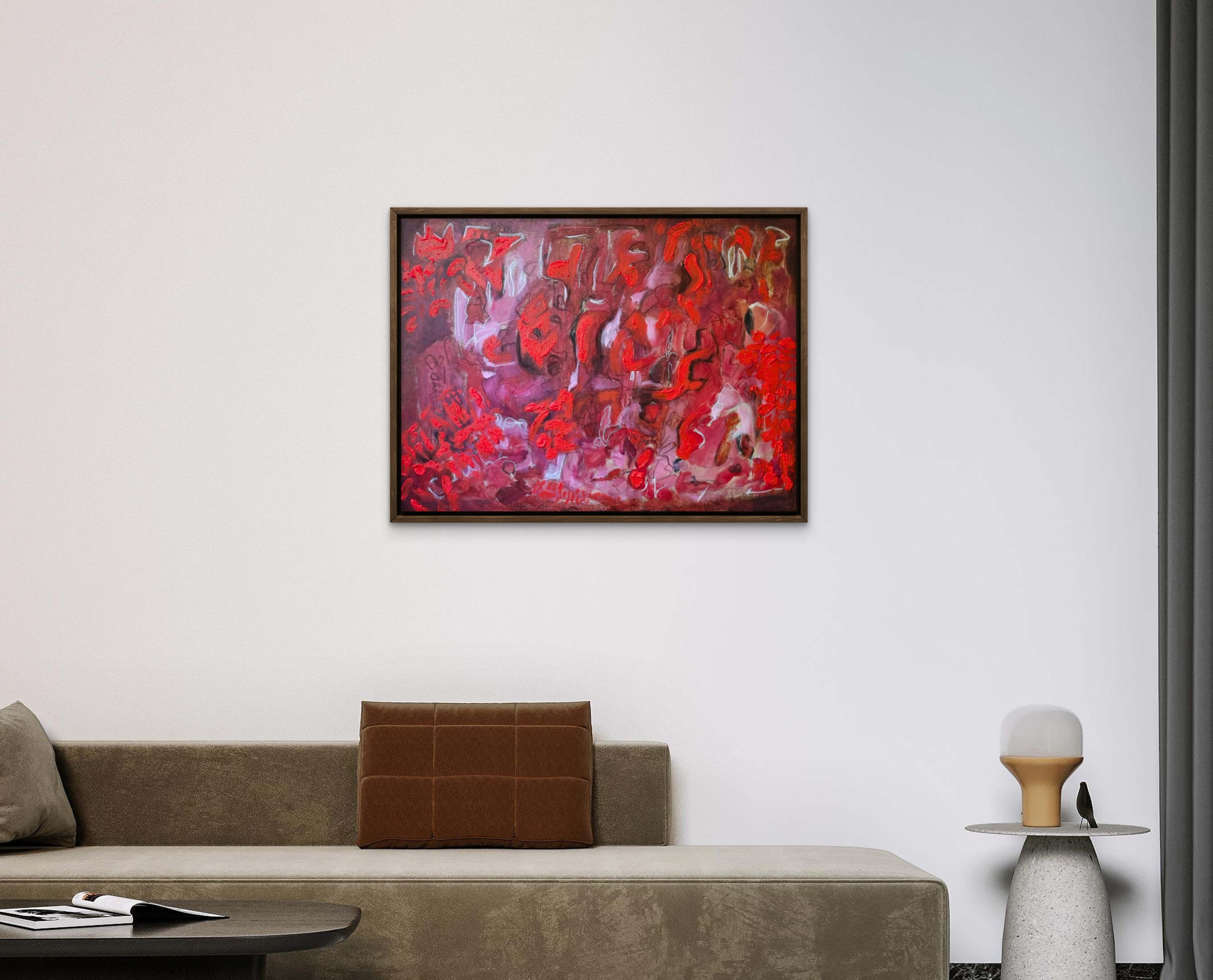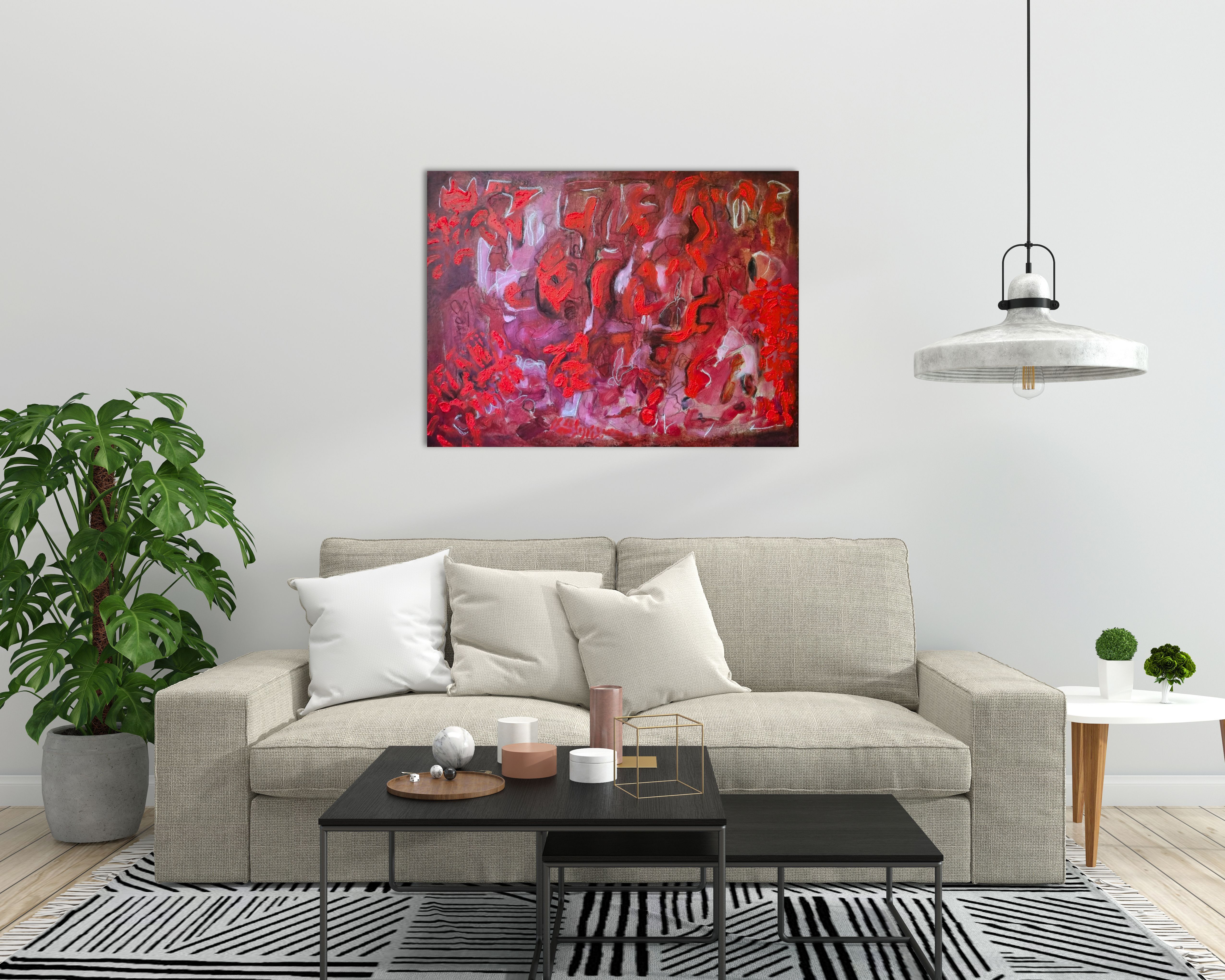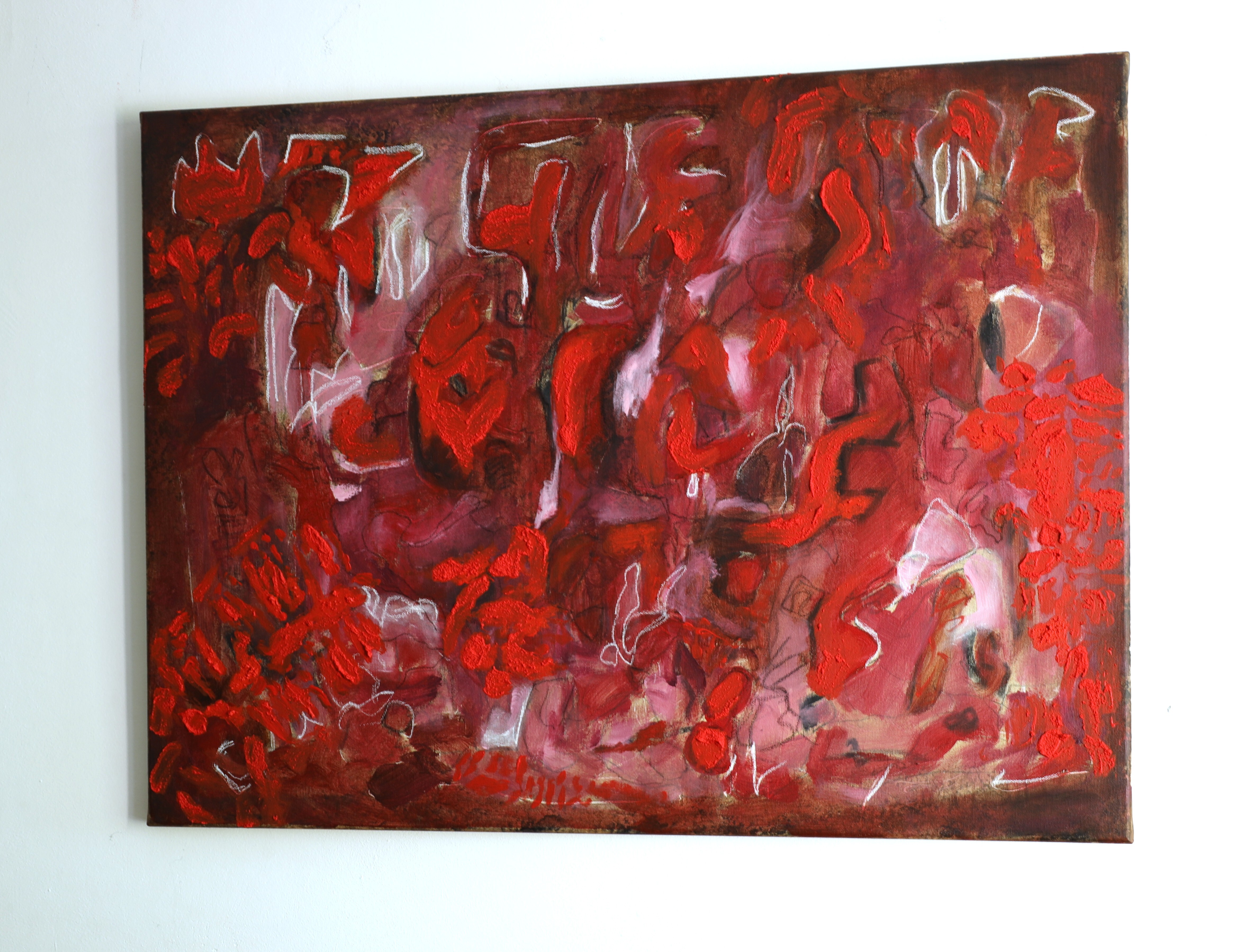 Obraz wykonany żywymi barwami - wieloma odcieniami czerwieni, różu, bieli.