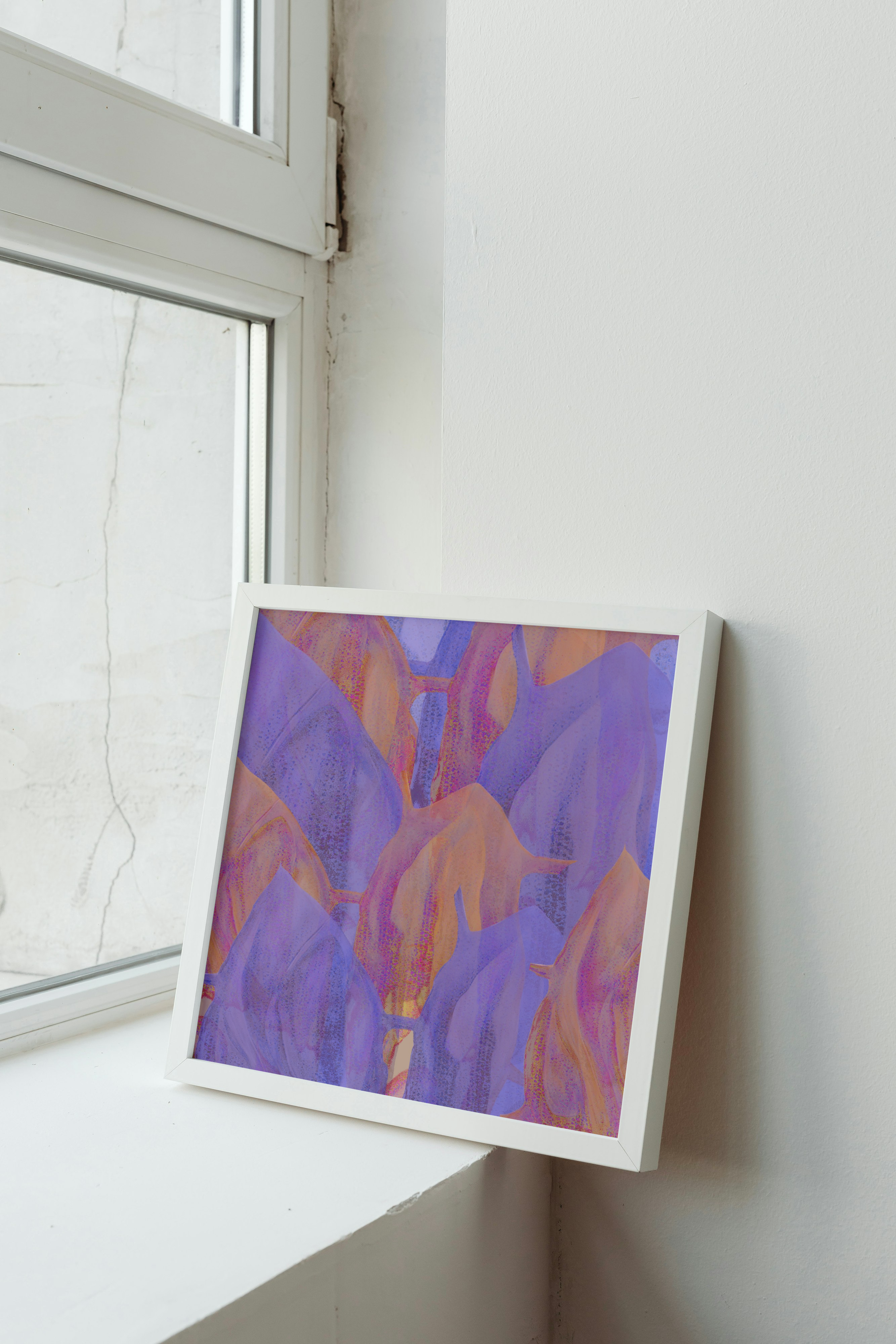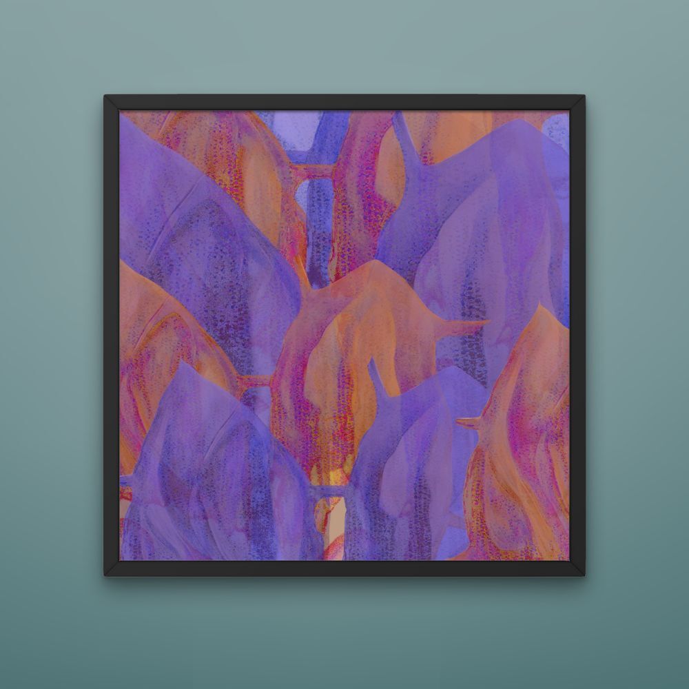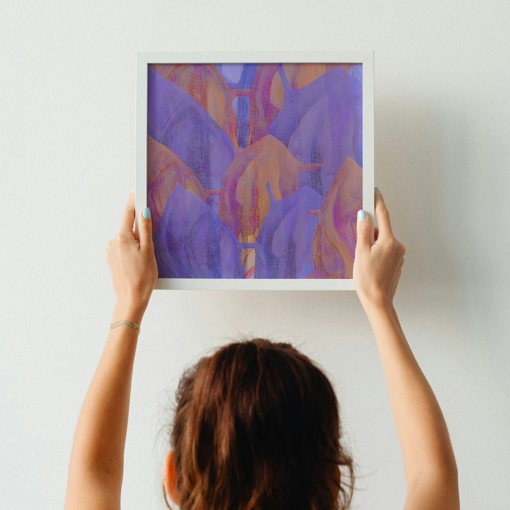 Ten plakat aż kipi kolorem i intensywnością! Zanurzone w fiolecie i pomarańczu liście wyglądają jakby tańczyły w świetle neonowego zmierzchu – botaniczna abstrakcja o zmysłowym charakterze.