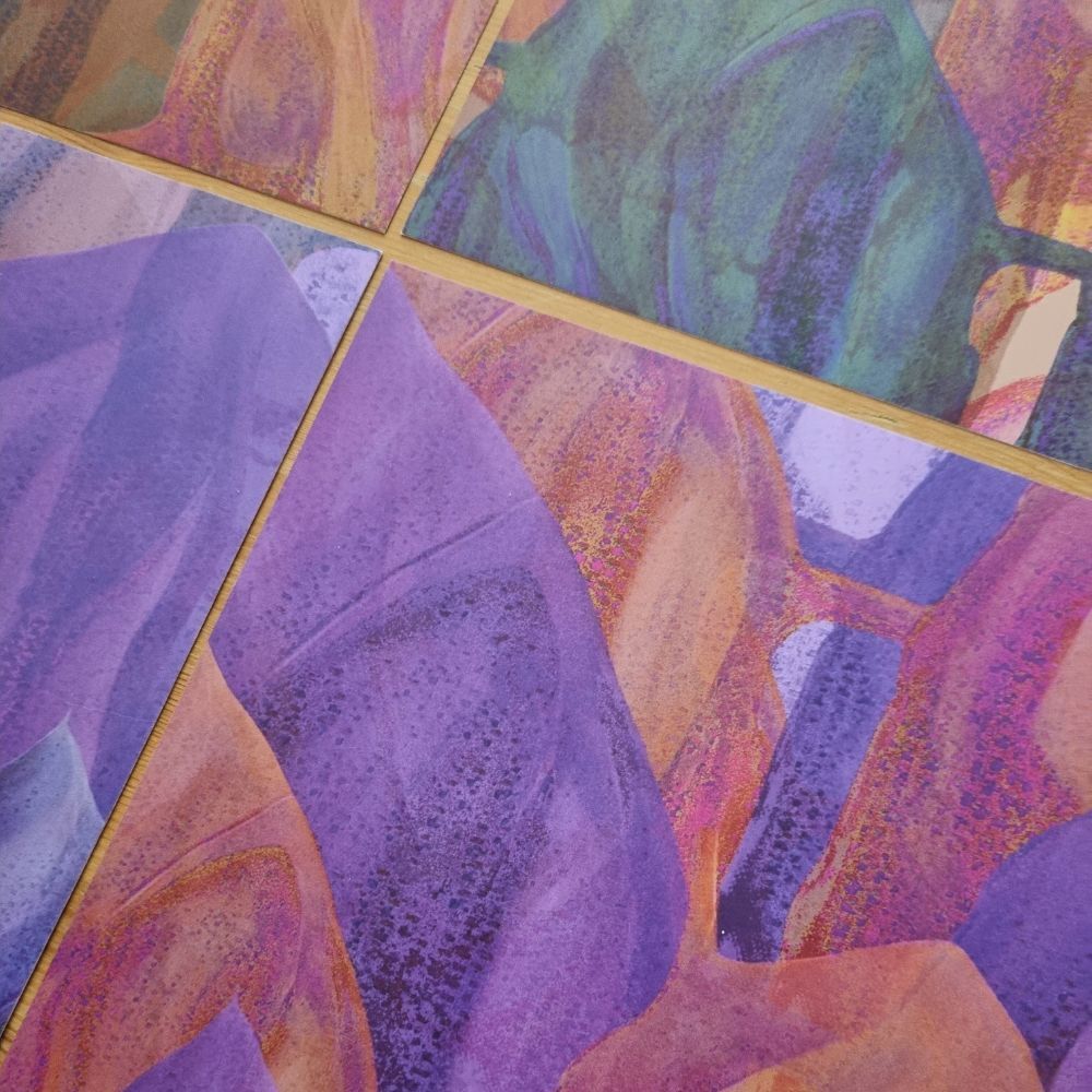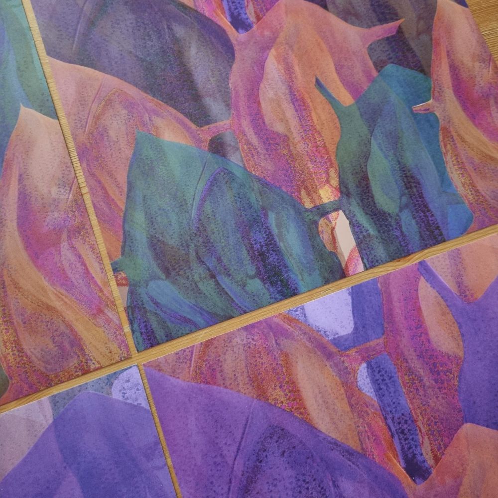 Liście? Płomienie? A może szept tropikalnej dżungli o zmierzchu? Ten plakat to żywiołowa mieszanka purpury, pomarańczu i błękitu – jakby natura sama postanowiła pomalować się na dyskotekę.