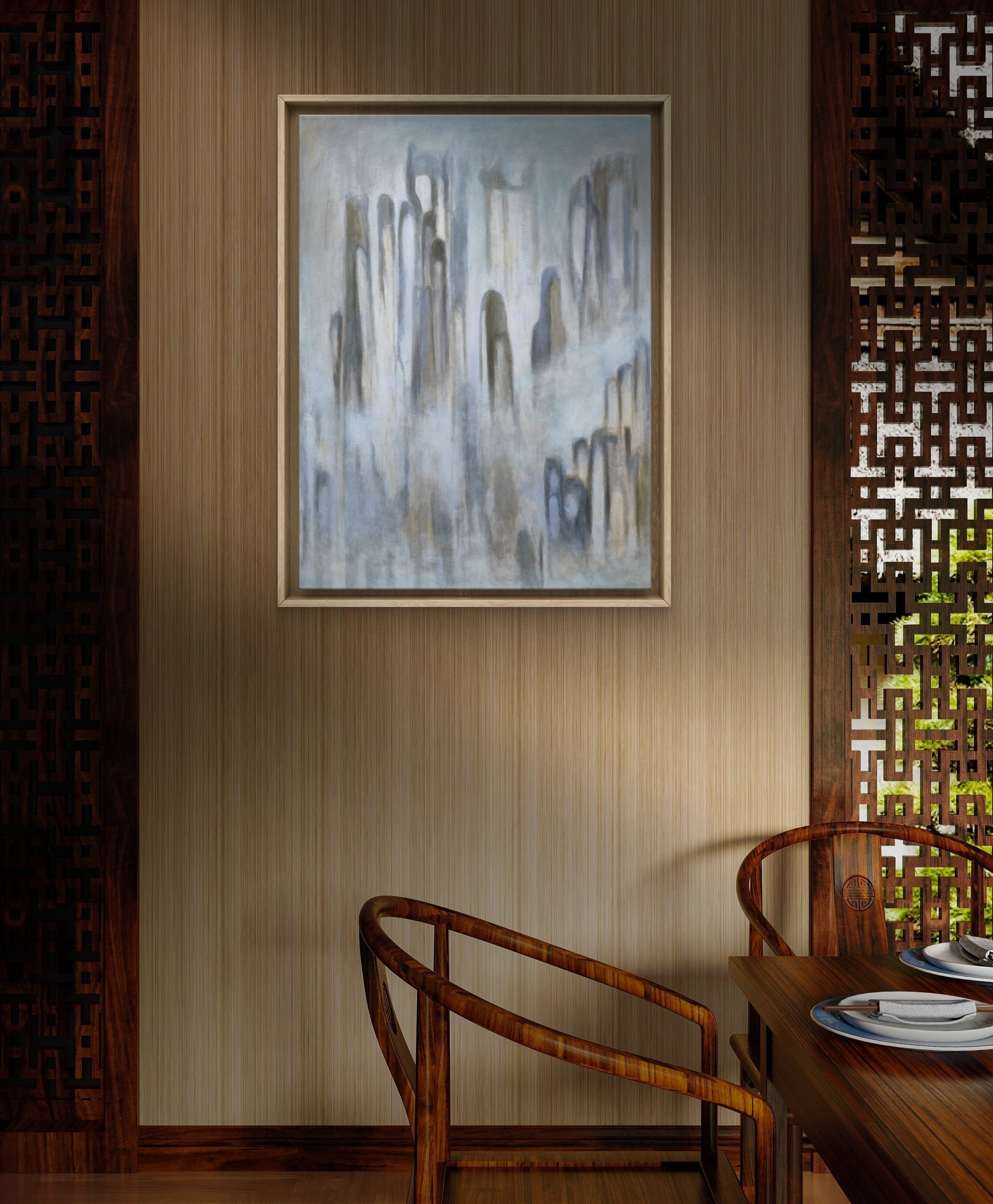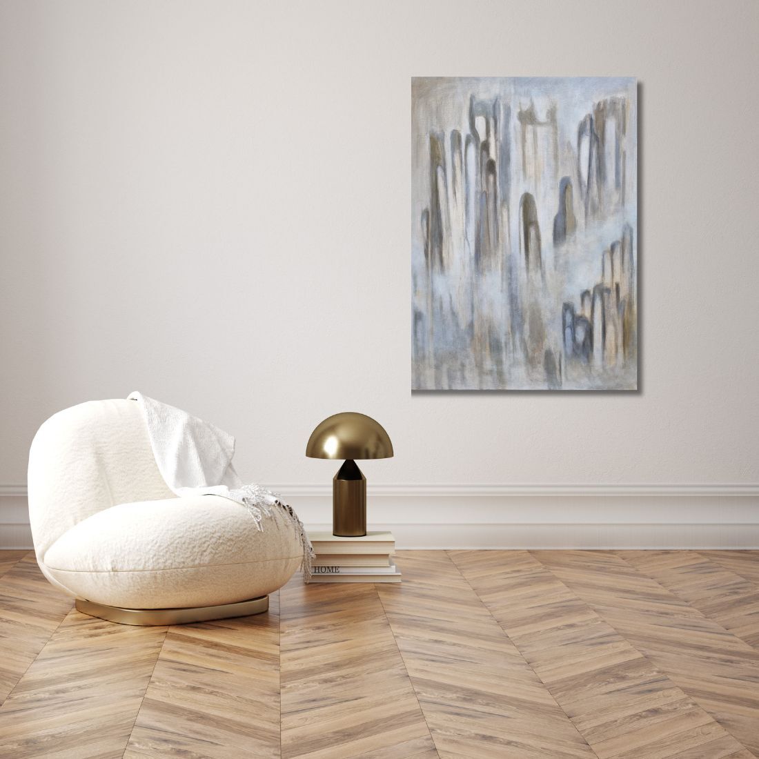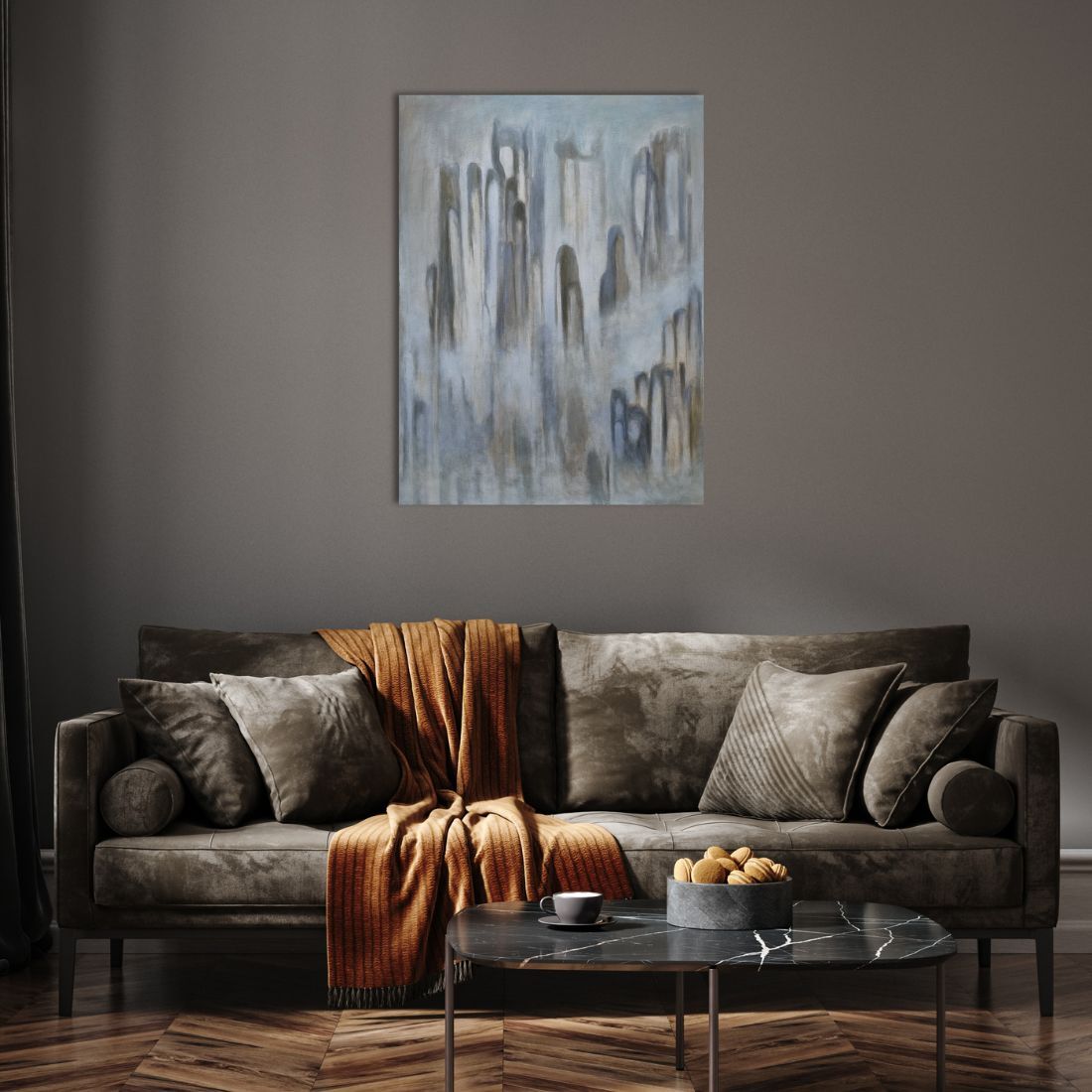 Zamglony, wykonany stonowanymi barwami.