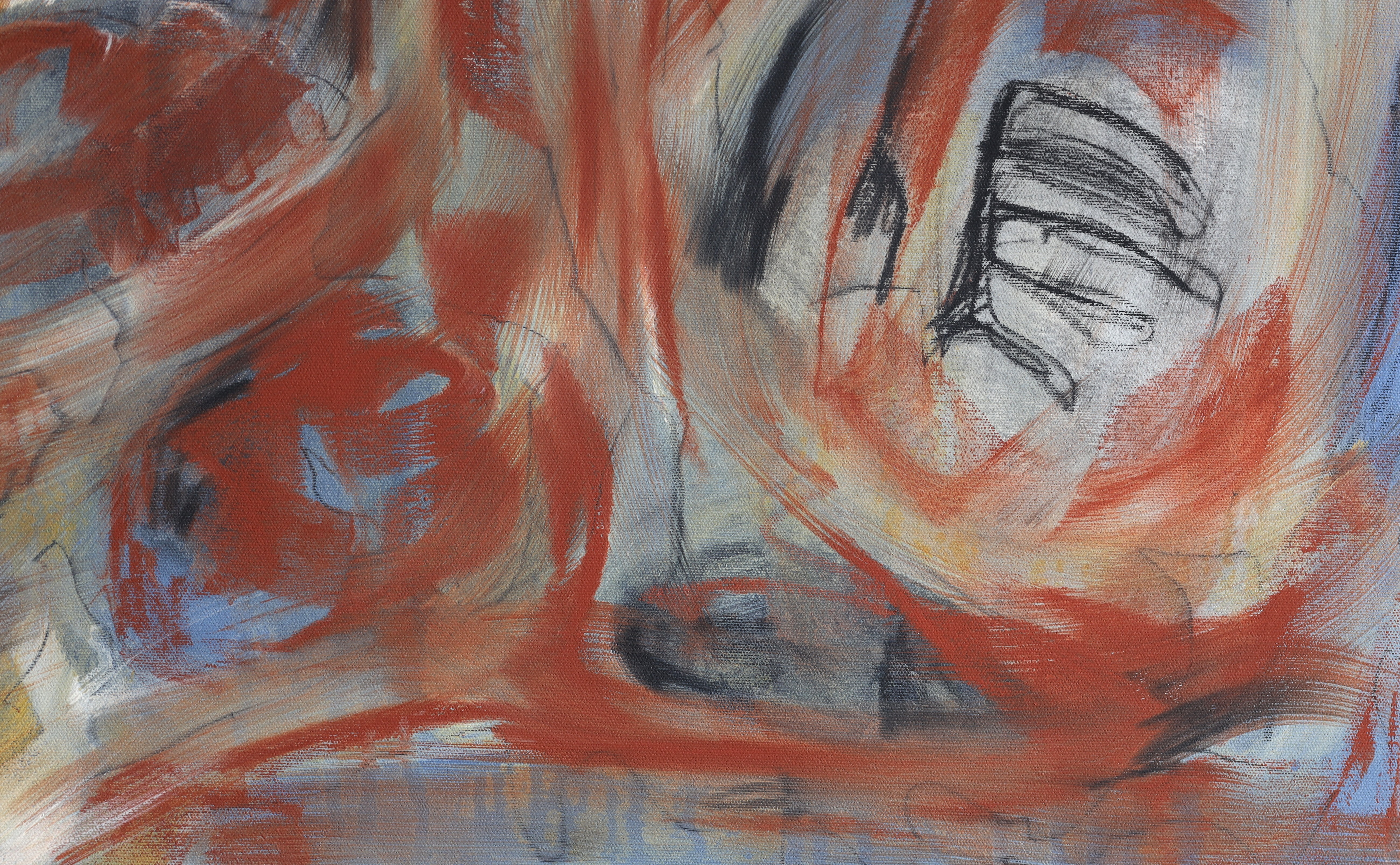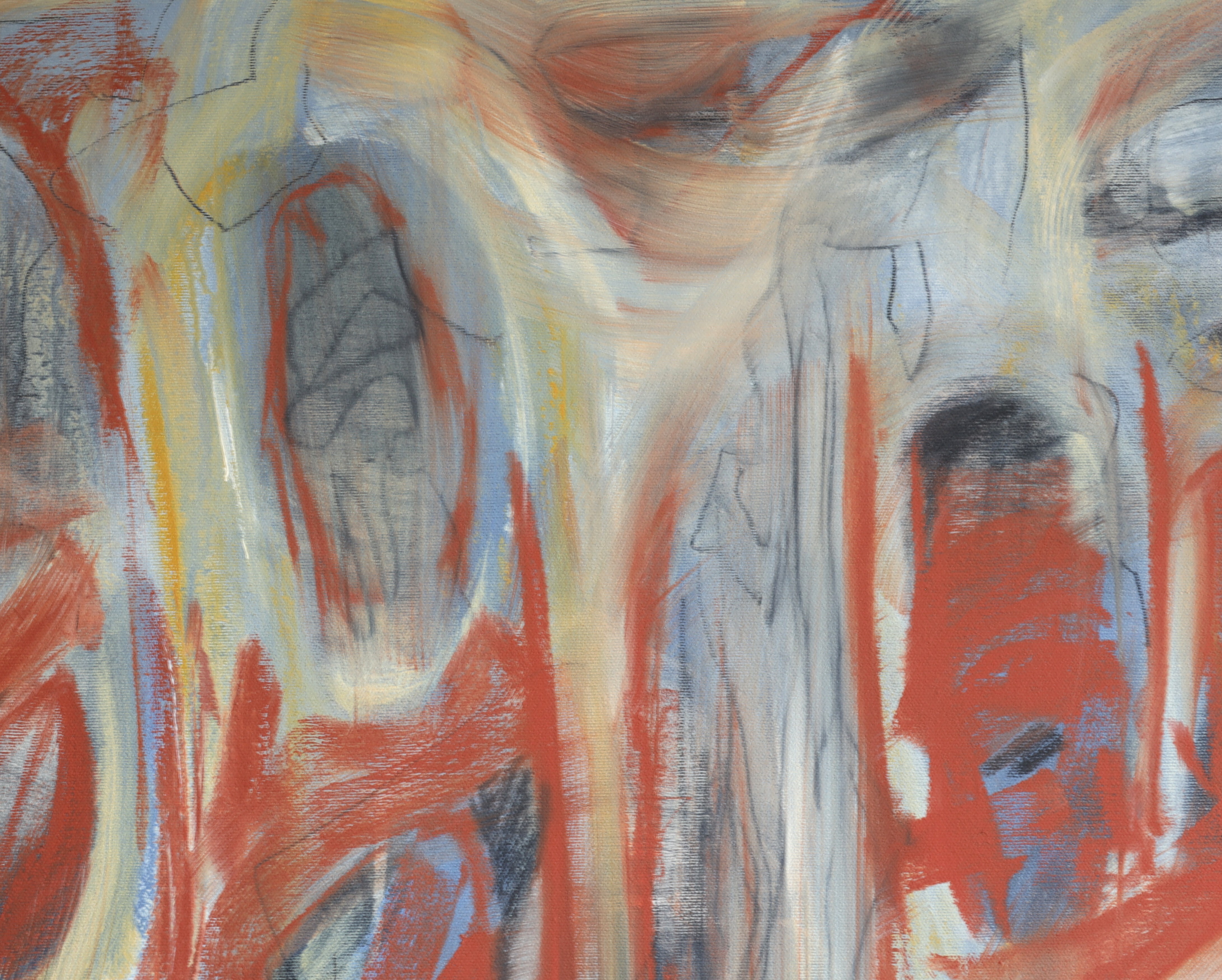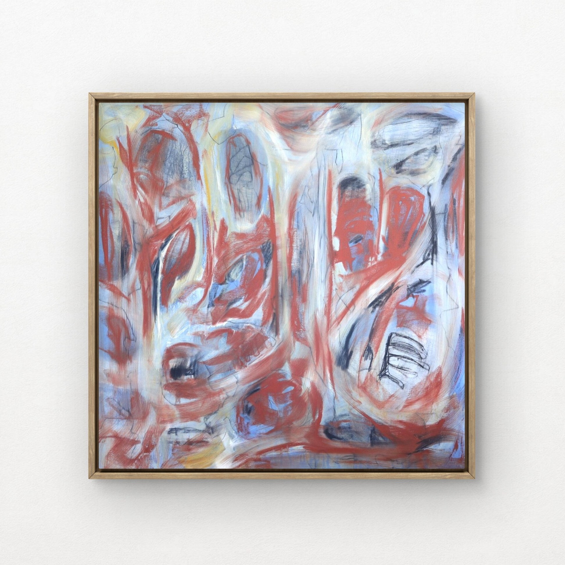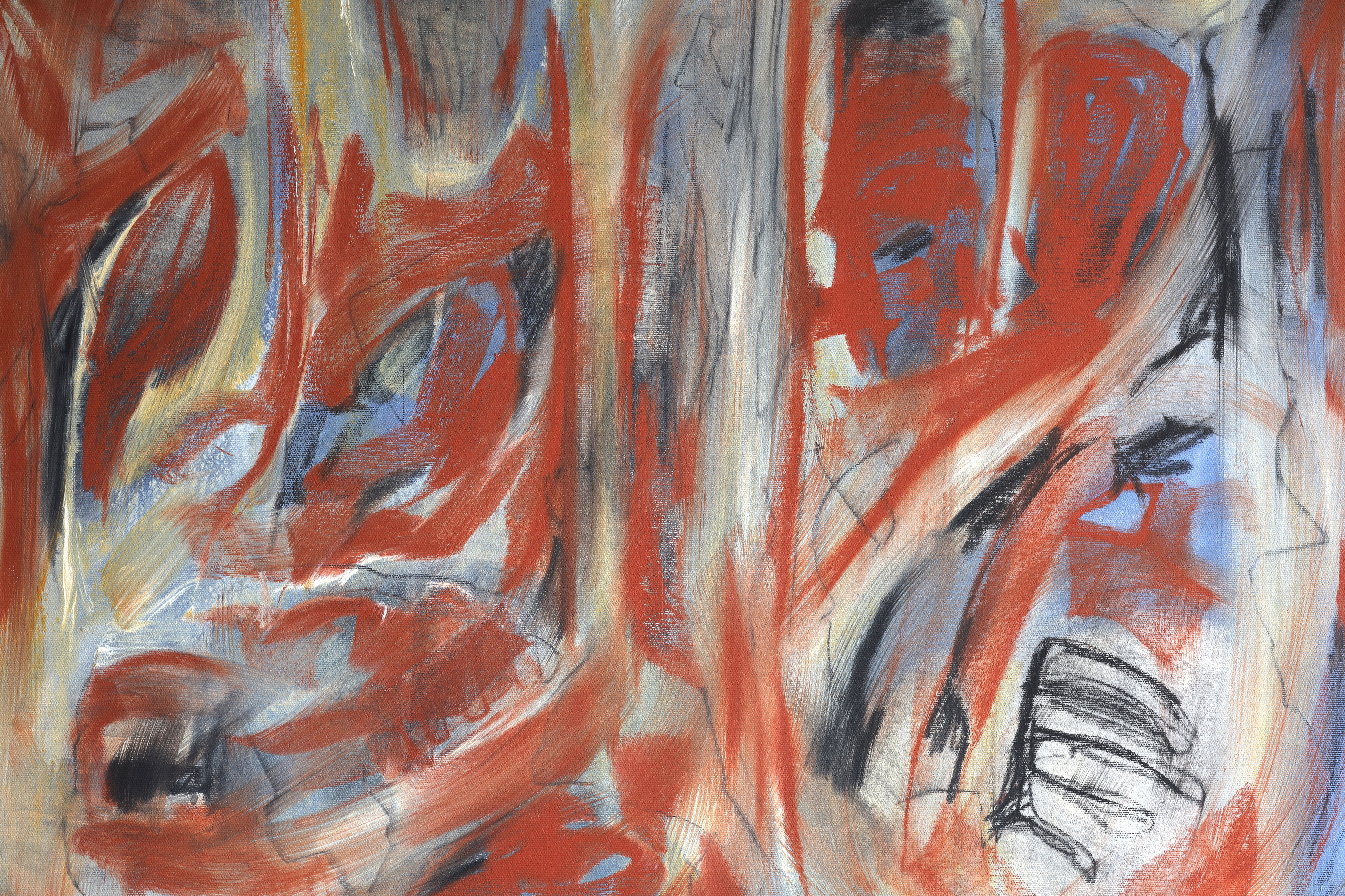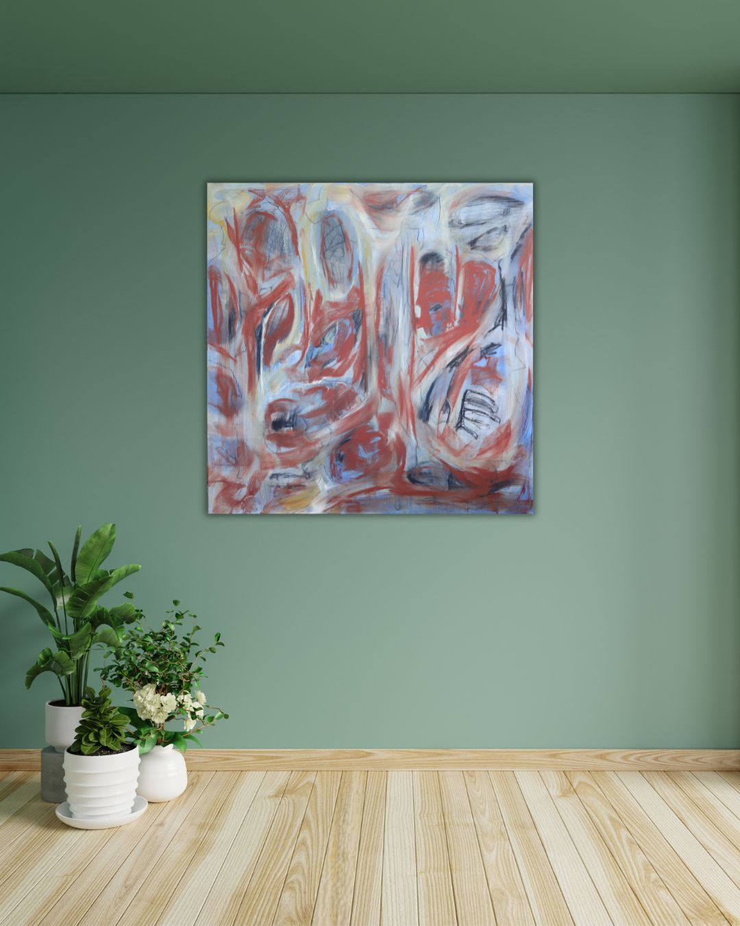 Ekspresyjny obraz w dużym formacie. Zastosowałam miejscami efekty rozmycia oraz ekspresyjne pociągnięcia węglem oraz sangwiną. Z odległości widoczne organiczne przenikające się kształty. Będzie pięknie prezentował się w jasnych wnętrzach dodając im kontrastu oraz punktu zaczepienia.
