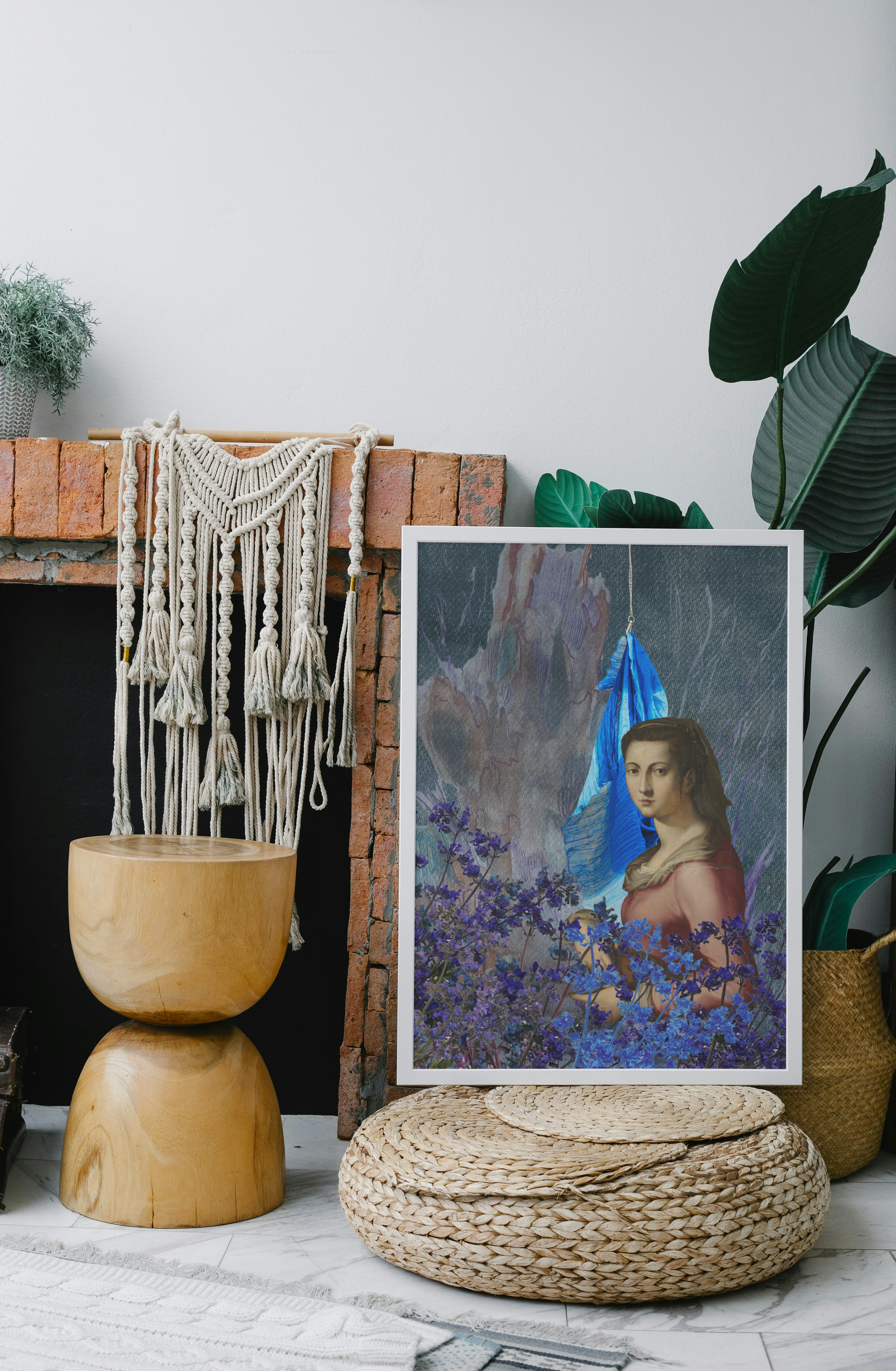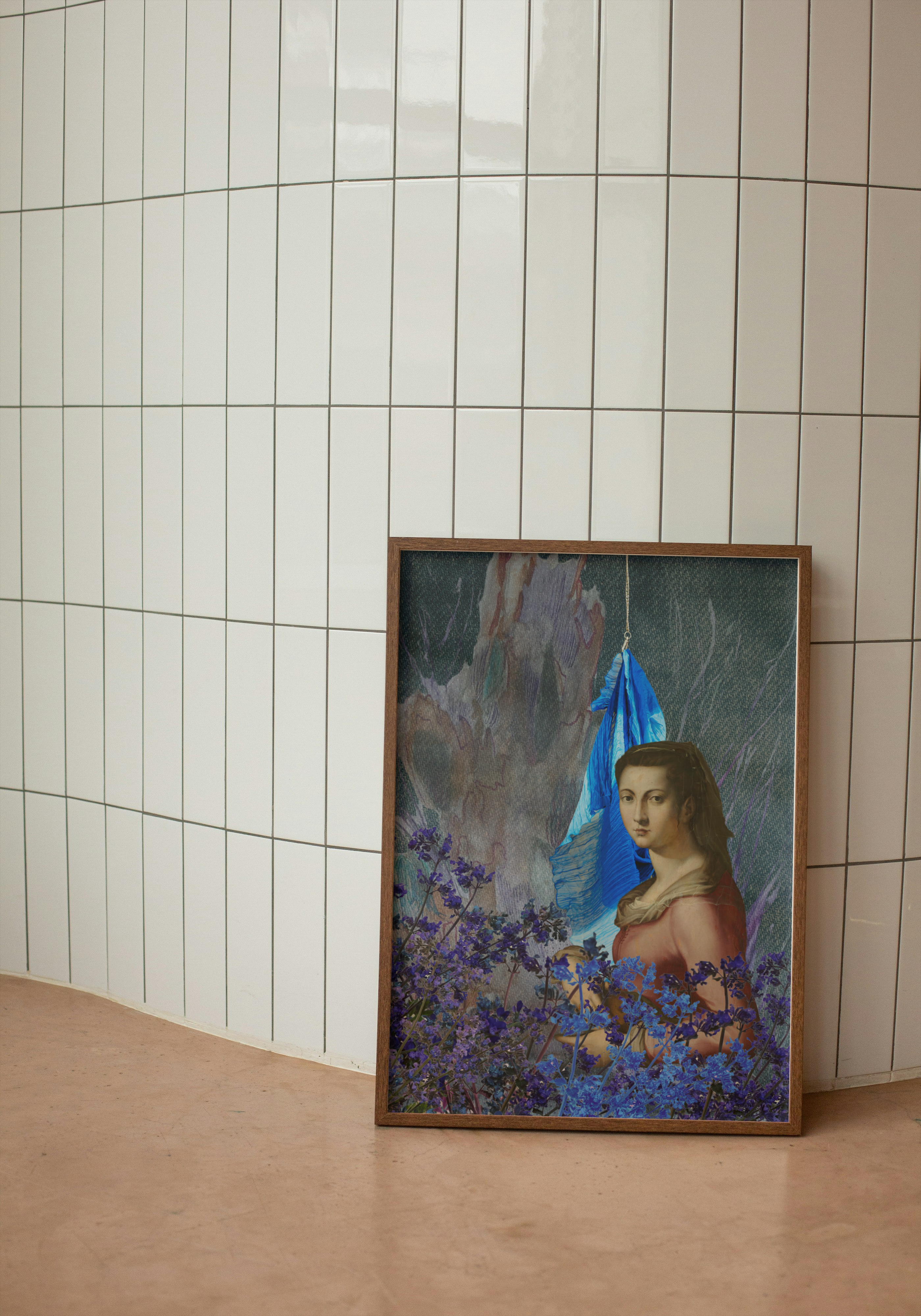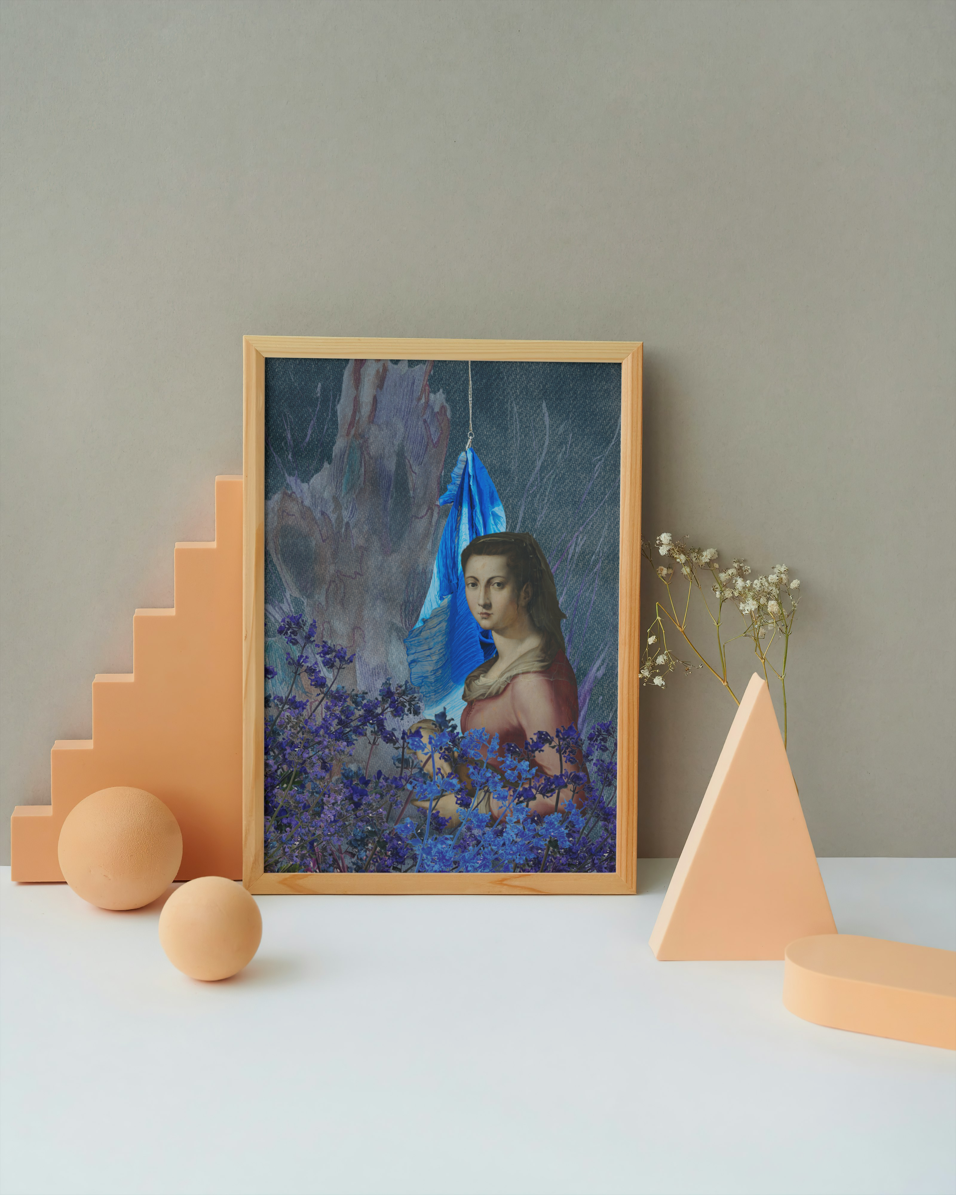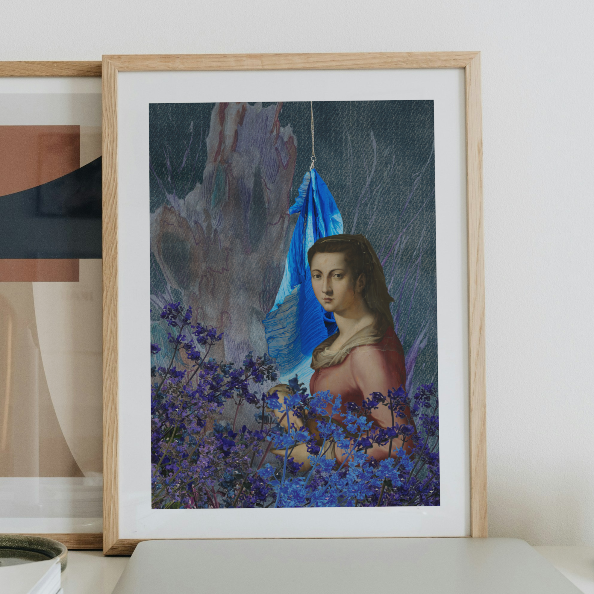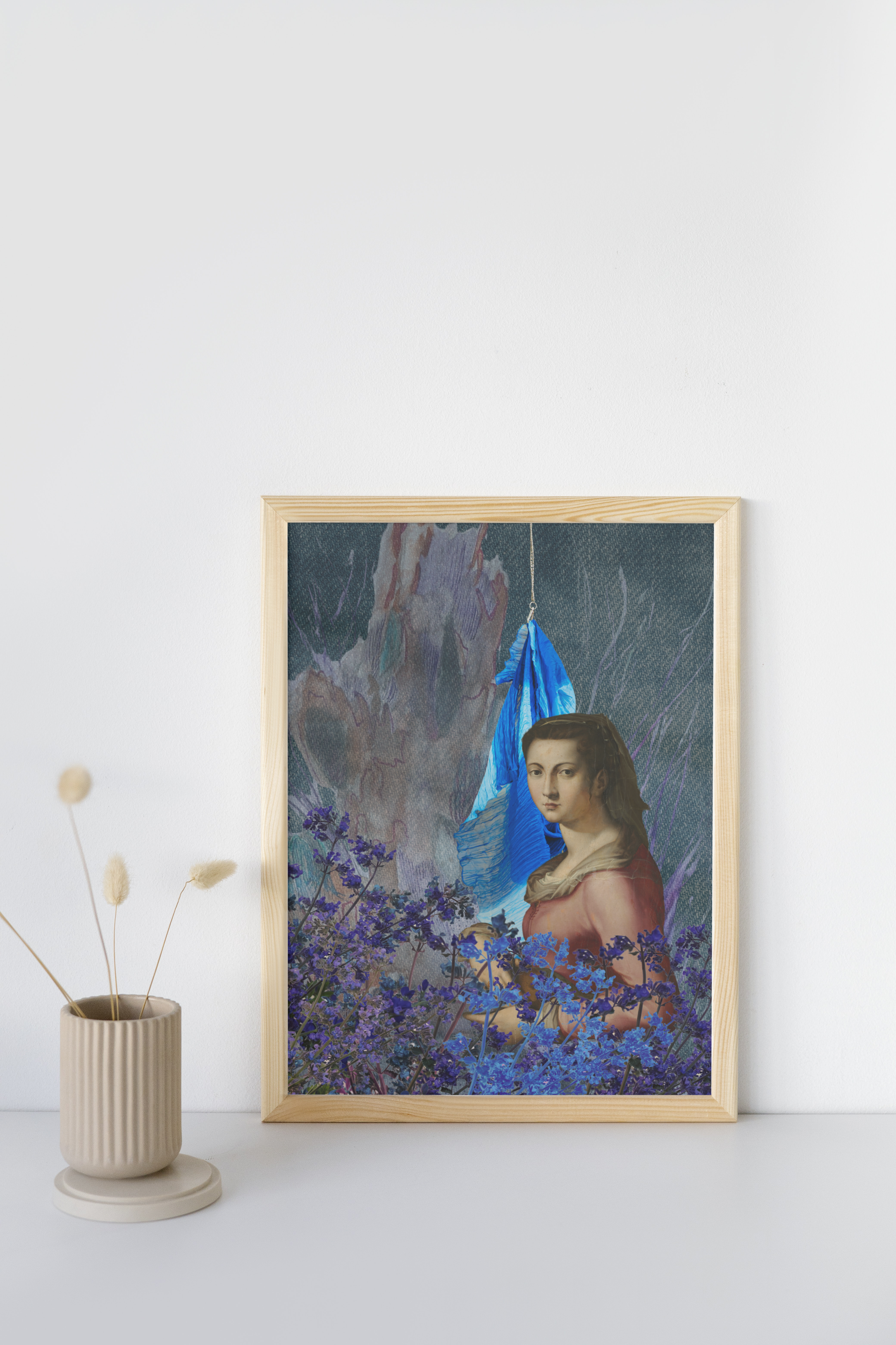 Artystyczny plakat kolaż łączący klasyczny portret z nowoczesną grafiką. Intensywny błękit i fioletowe kwiaty tworzą wyrazistą kompozycję o eleganckim, nieco tajemniczym charakterze. Idealny do salonu, sypialni, biura lub gabinetu.