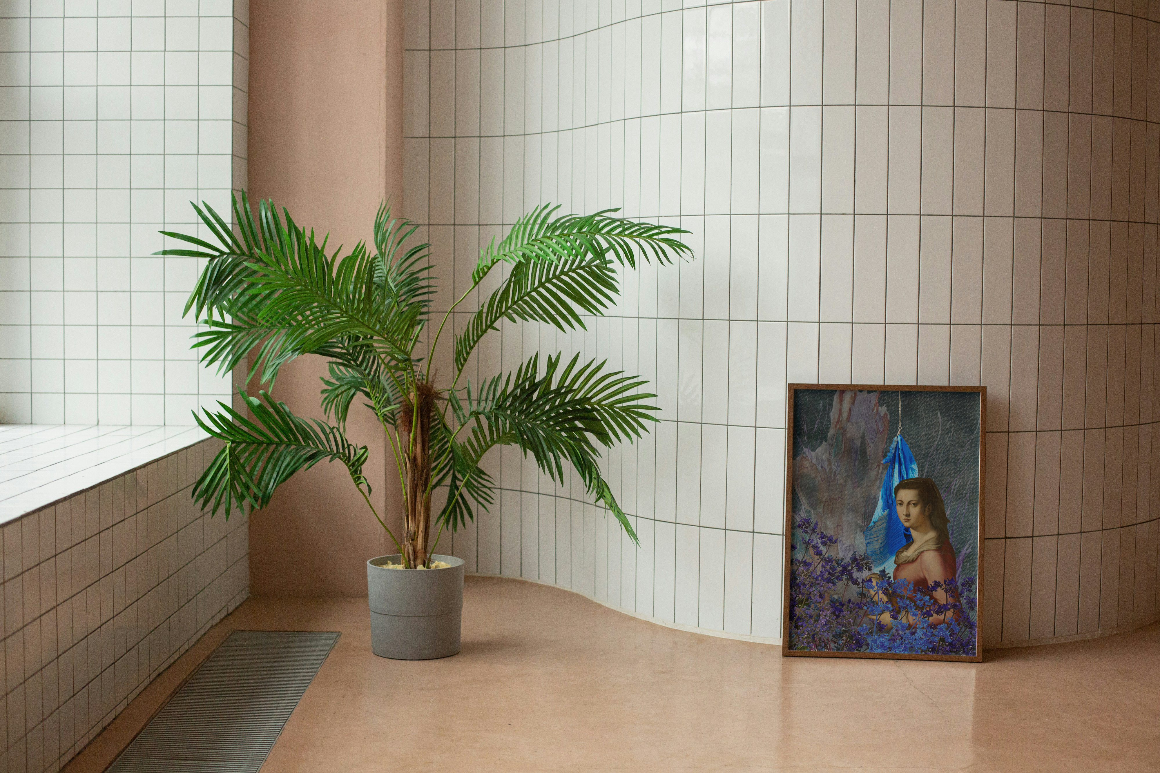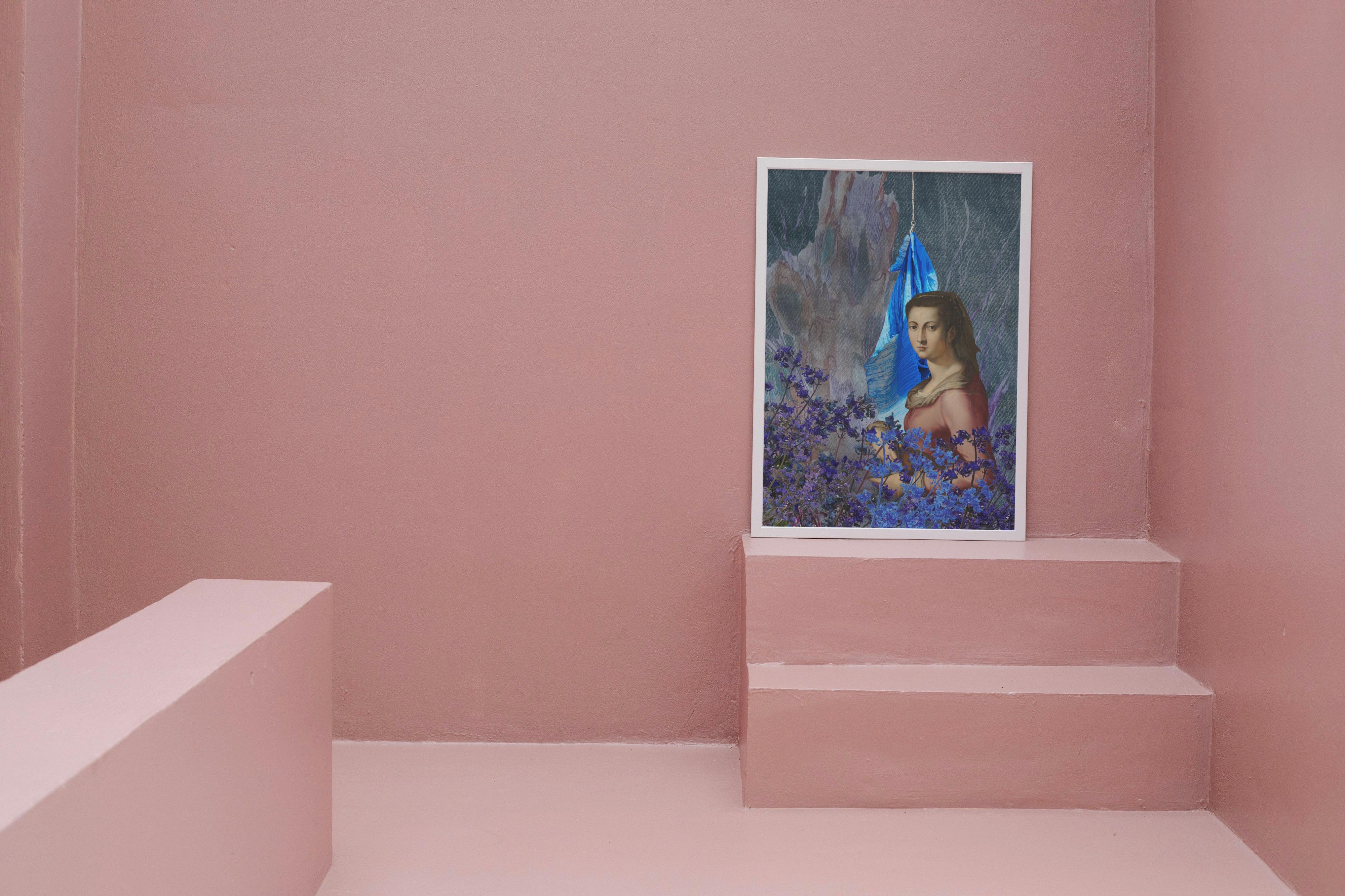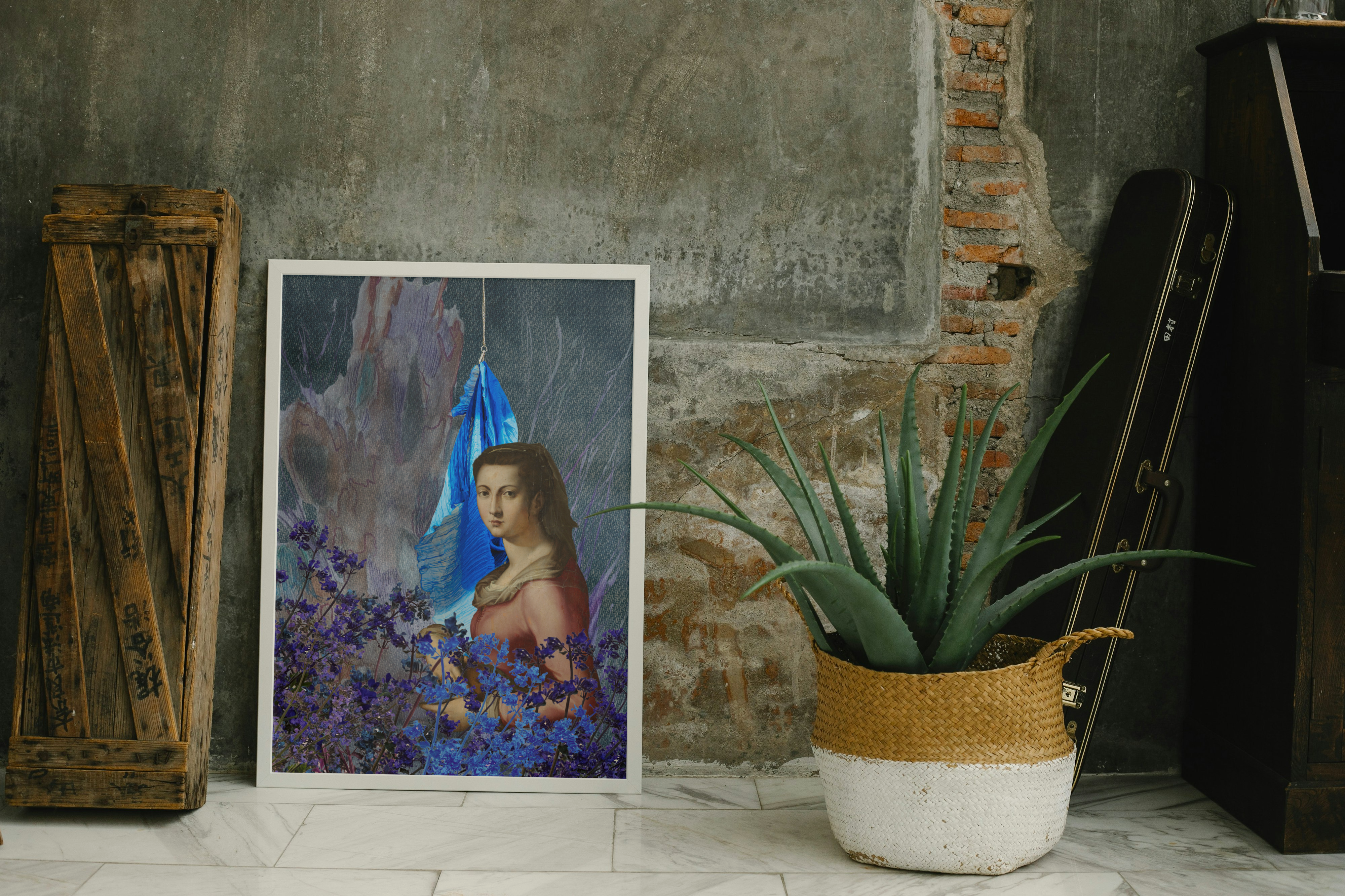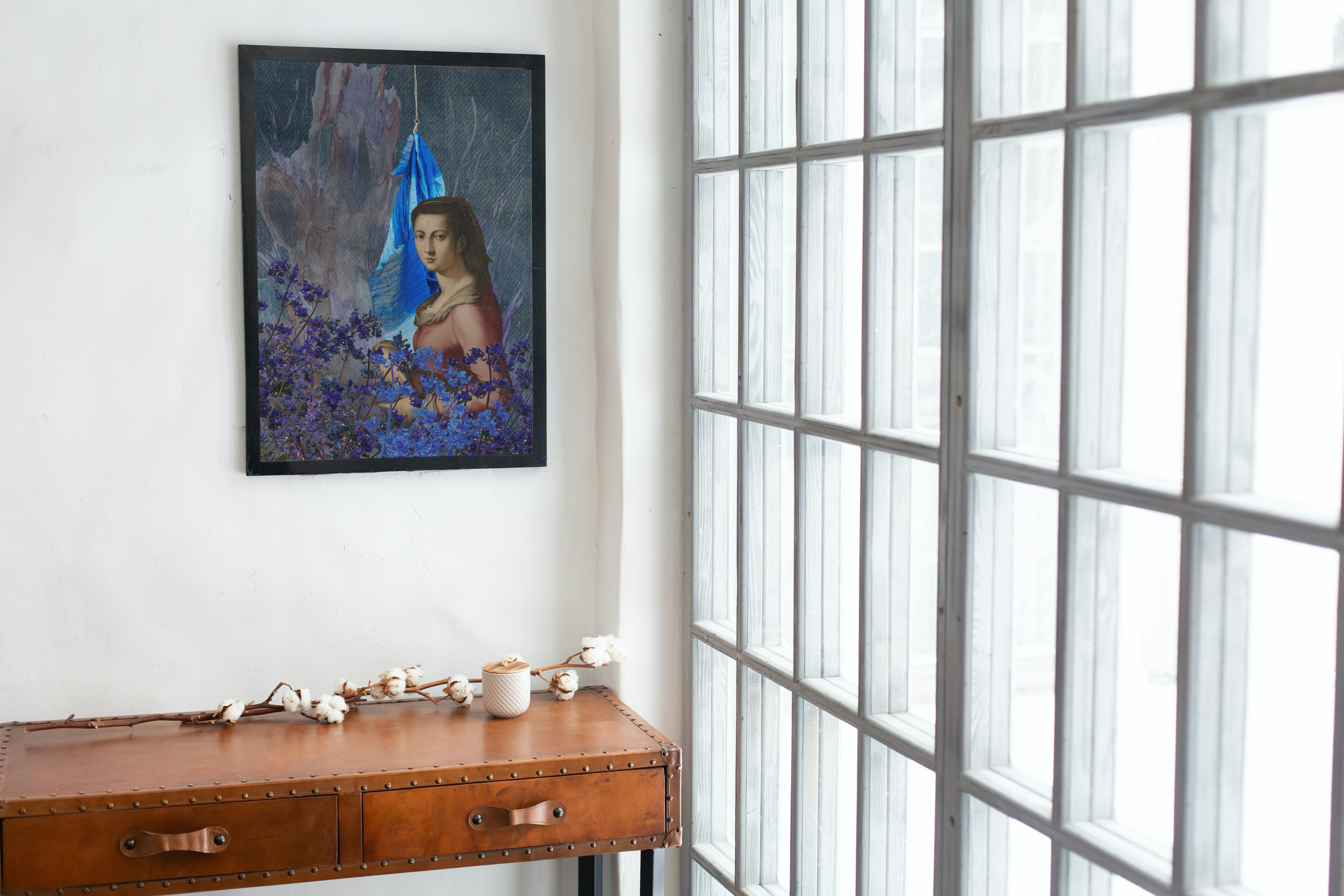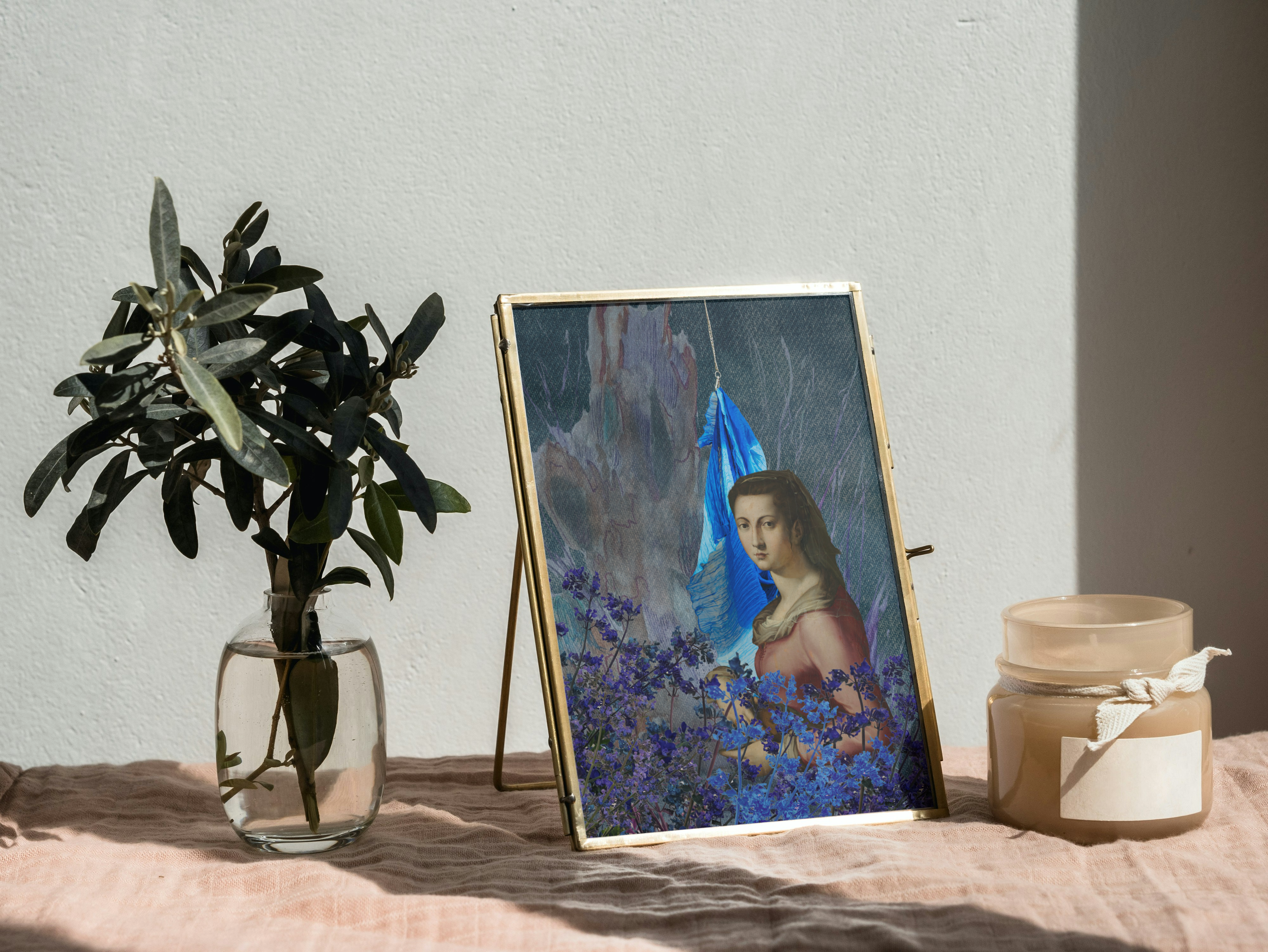 Artystyczny plakat kolaż łączący klasyczny portret z nowoczesną grafiką. Intensywny błękit i fioletowe kwiaty tworzą wyrazistą kompozycję o eleganckim, nieco tajemniczym charakterze. Idealny do salonu, sypialni, biura lub gabinetu.