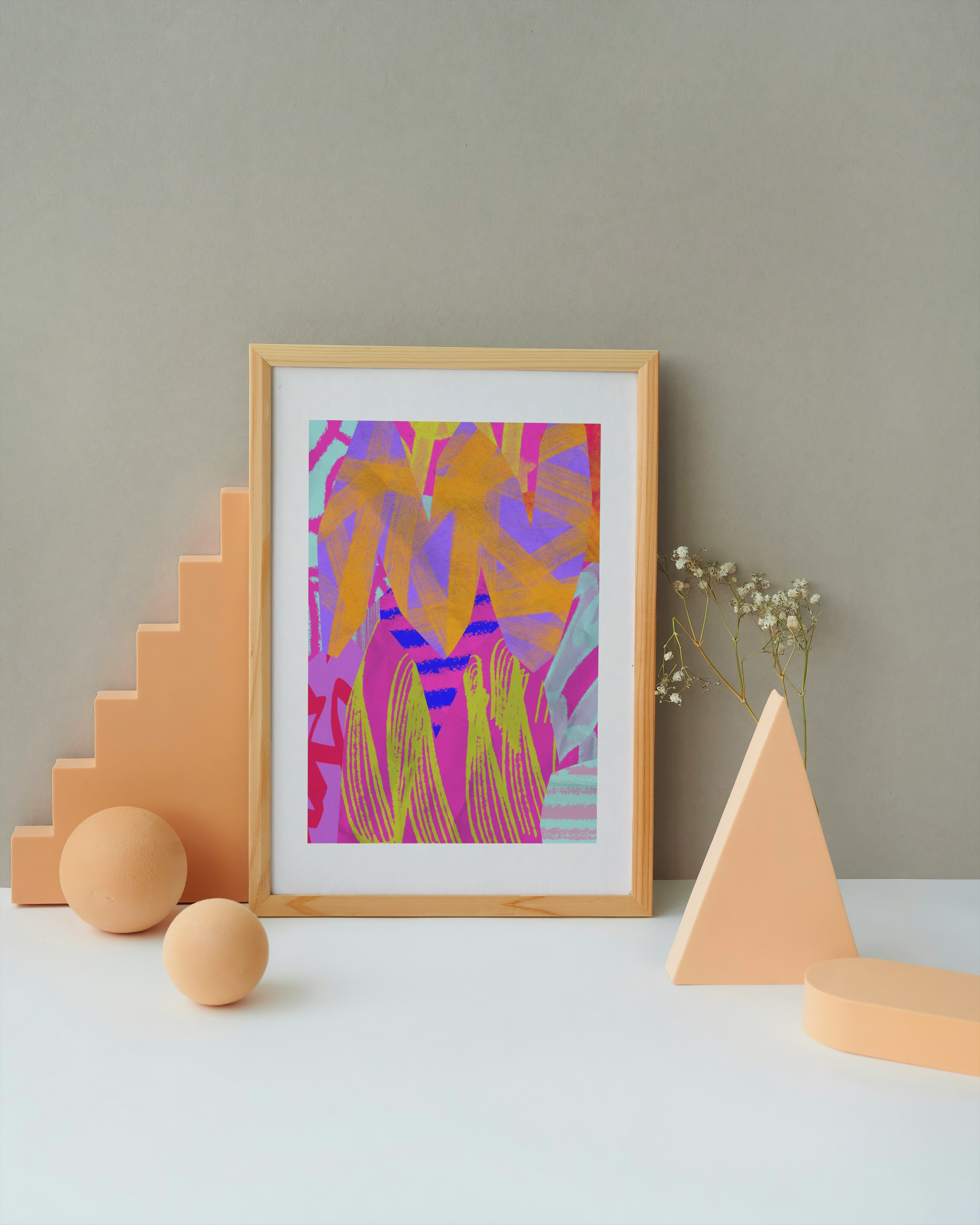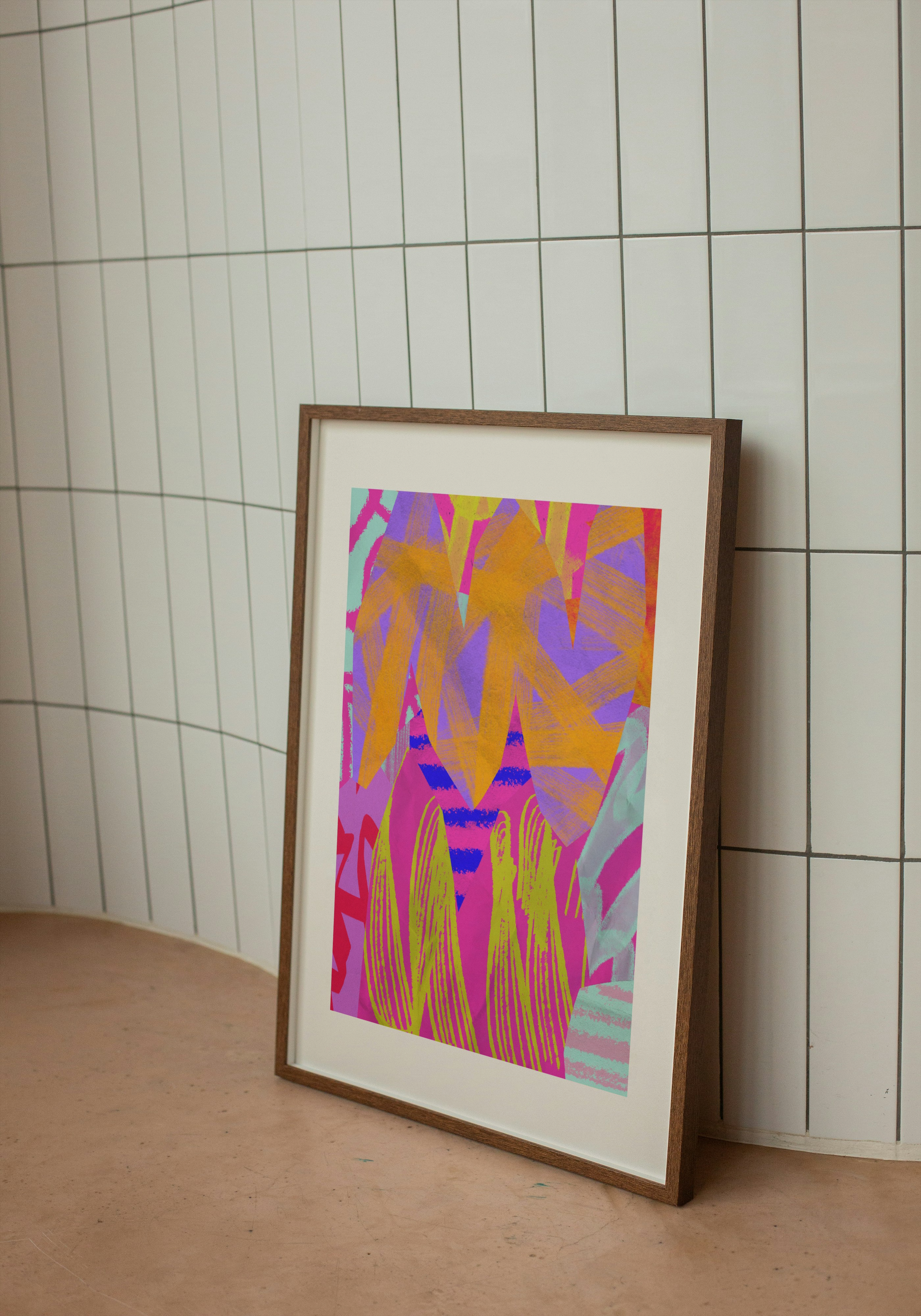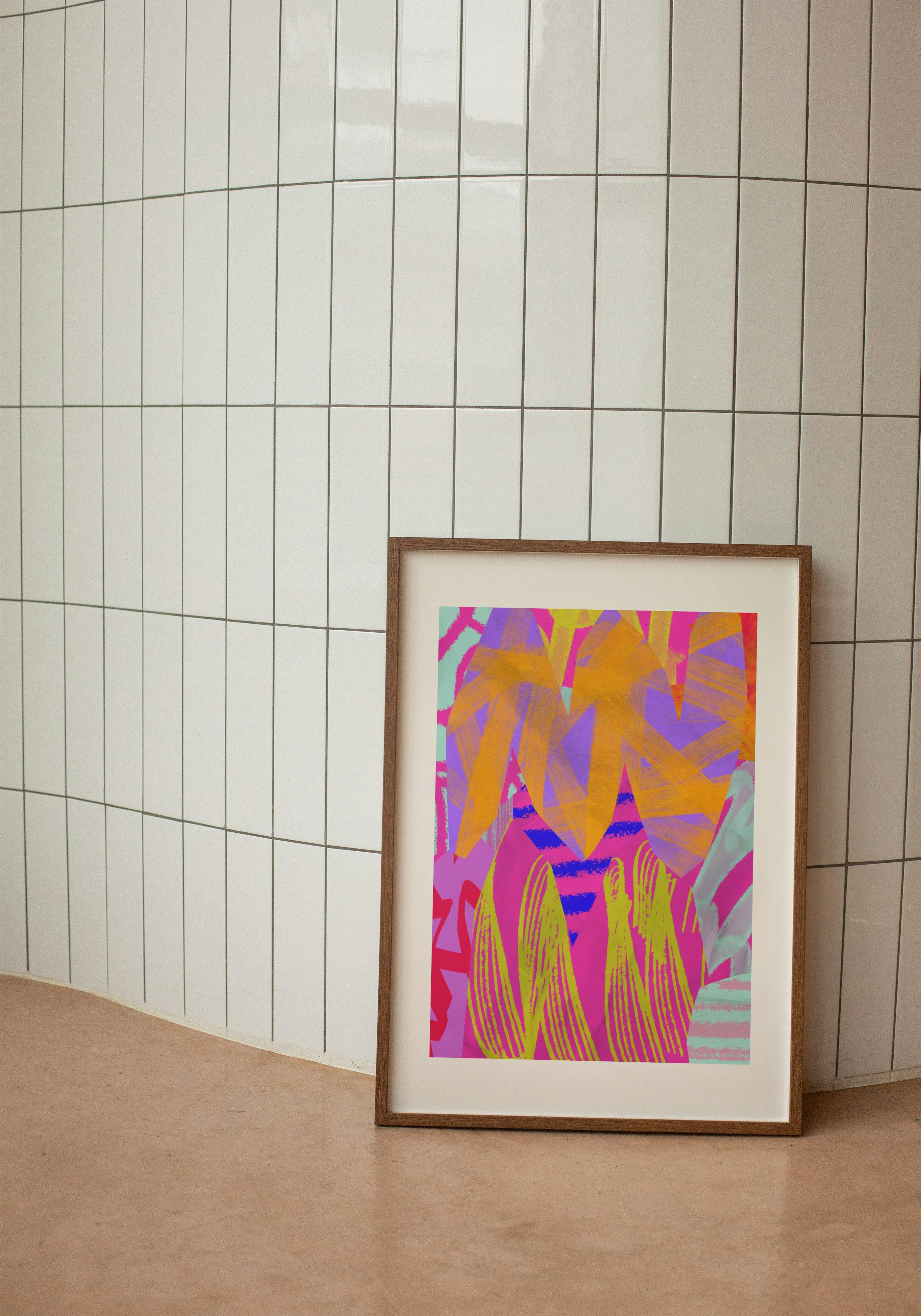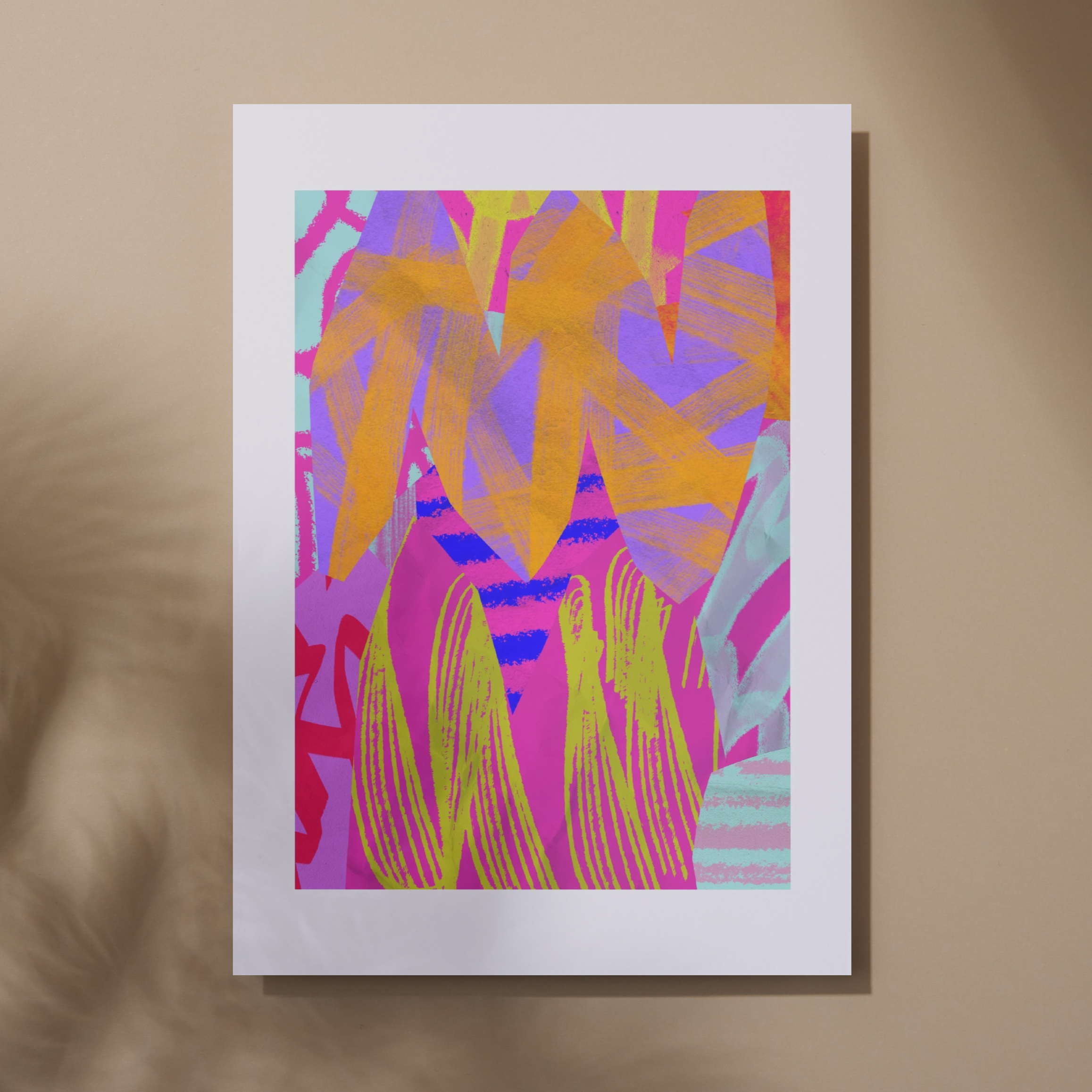 Kiedy liście przestają być grzeczne i zaczynają imprezować. Ten plakat to szalona mikstura kolorów i kształtów – jakby tropikalna dżungla wskoczyła w lateks i fluorescencję.