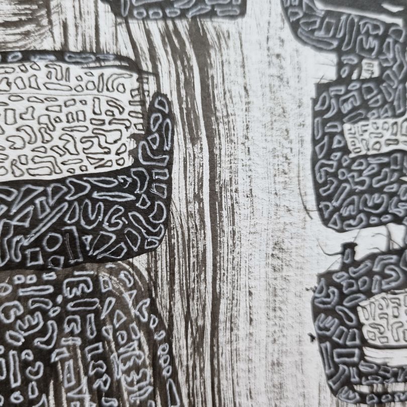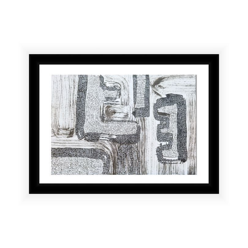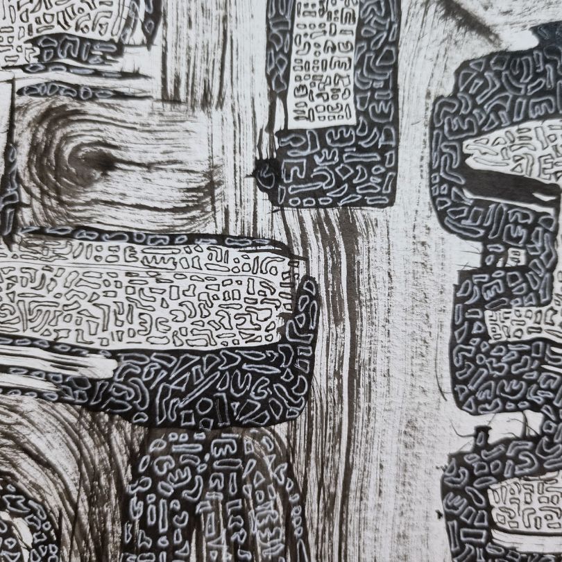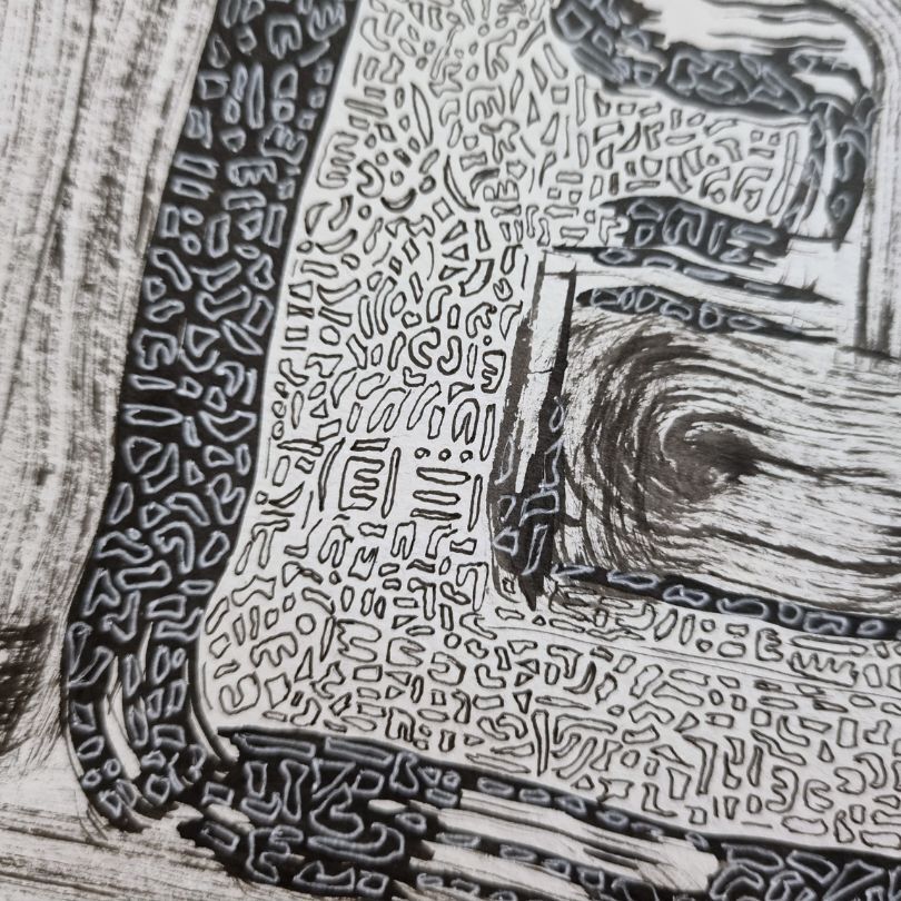 Rysunek wykonany tuszem oraz metodą bardzo drobnych wzorków na papierze ozdobnym w kolorze złamanej bieli. Minimalistyczny, zachowany w kolorystyce czerni i bieli.