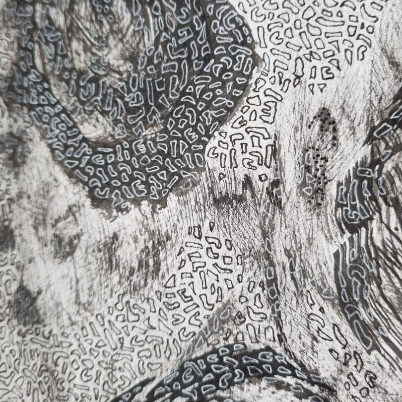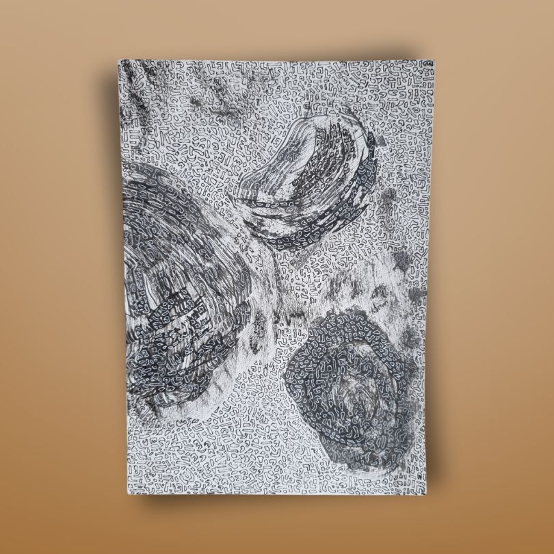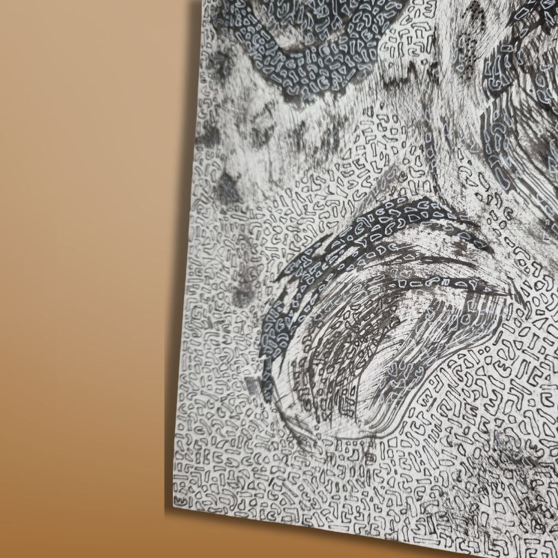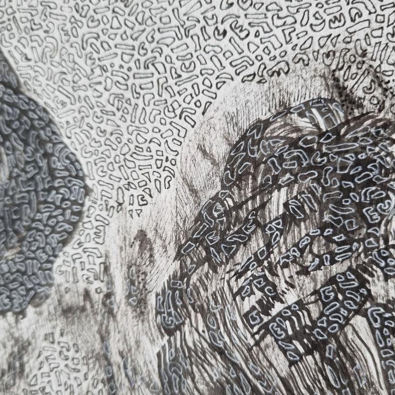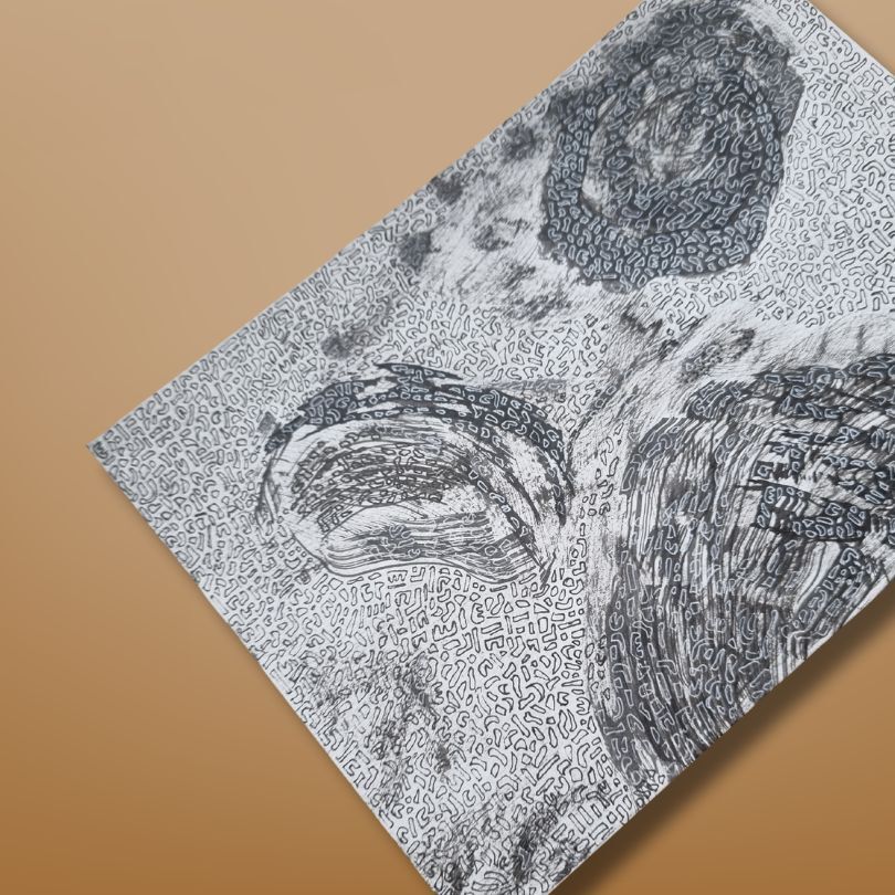 Rysunek wykonany tuszem oraz metodą bardzo drobnych wzorków na papierze ozdobnym w kolorze złamanej bieli. Minimalistyczny, zachowany w kolorystyce czerni i bieli.