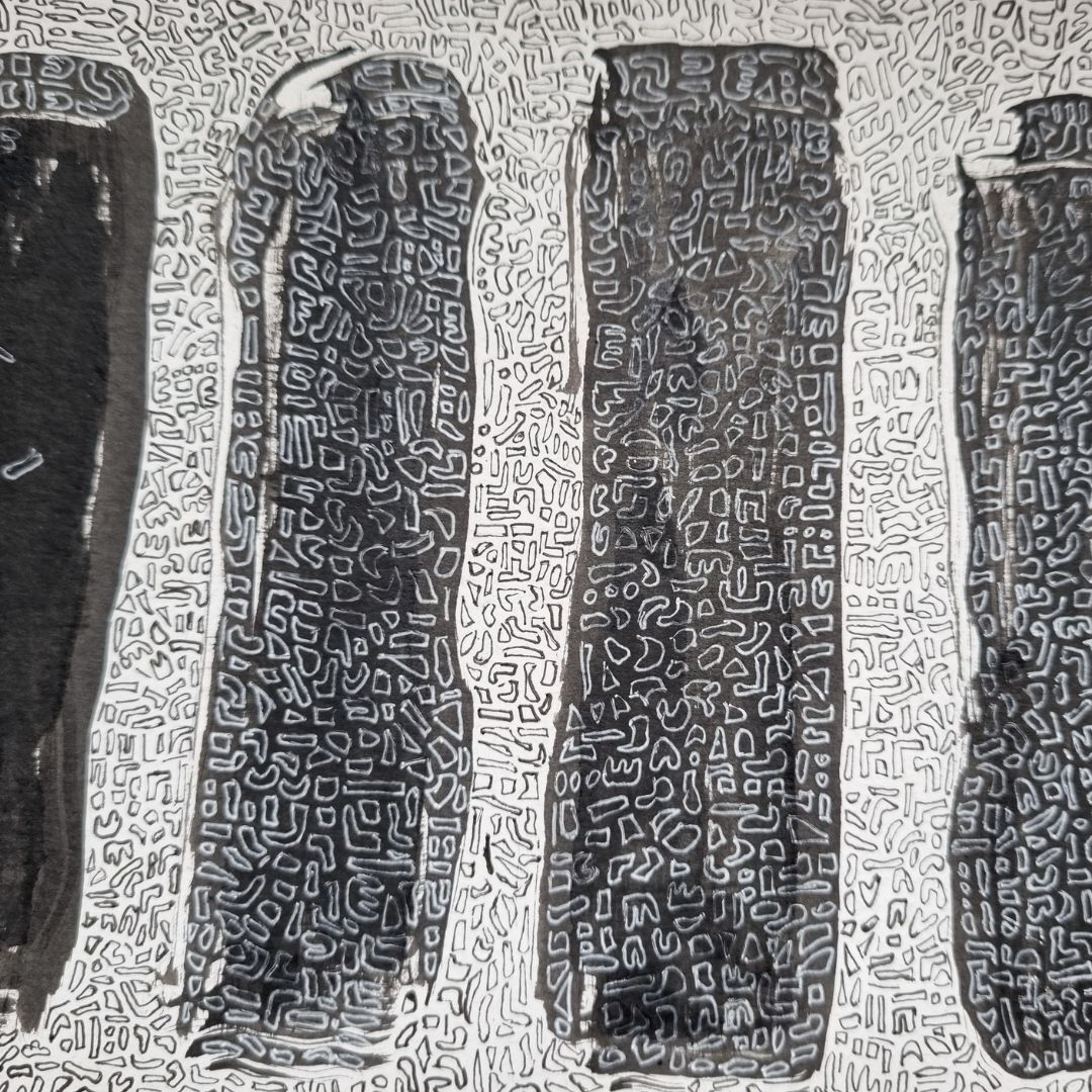 Rysunek tuszem i cienkopisami na papierze ozdobnym.