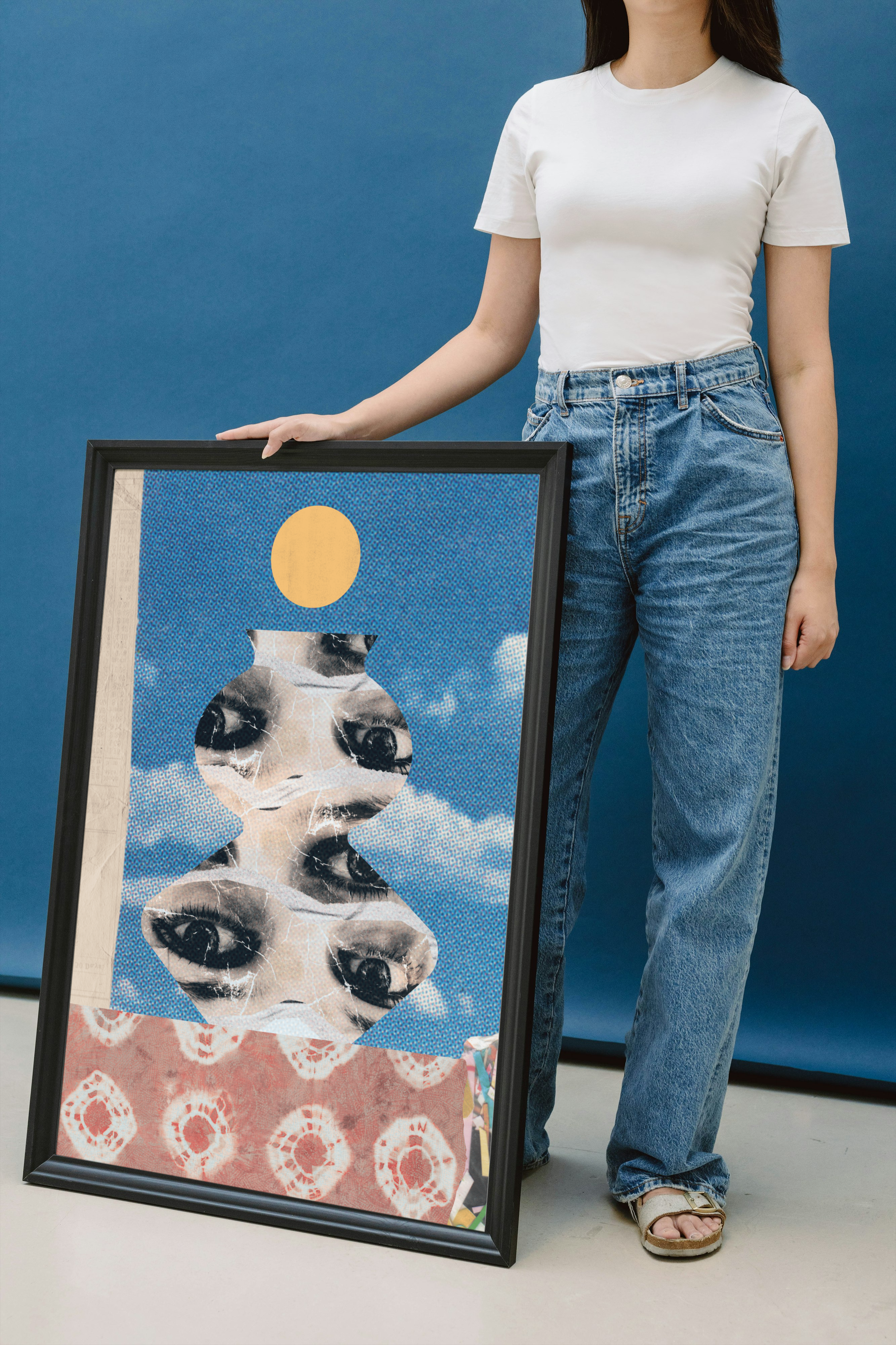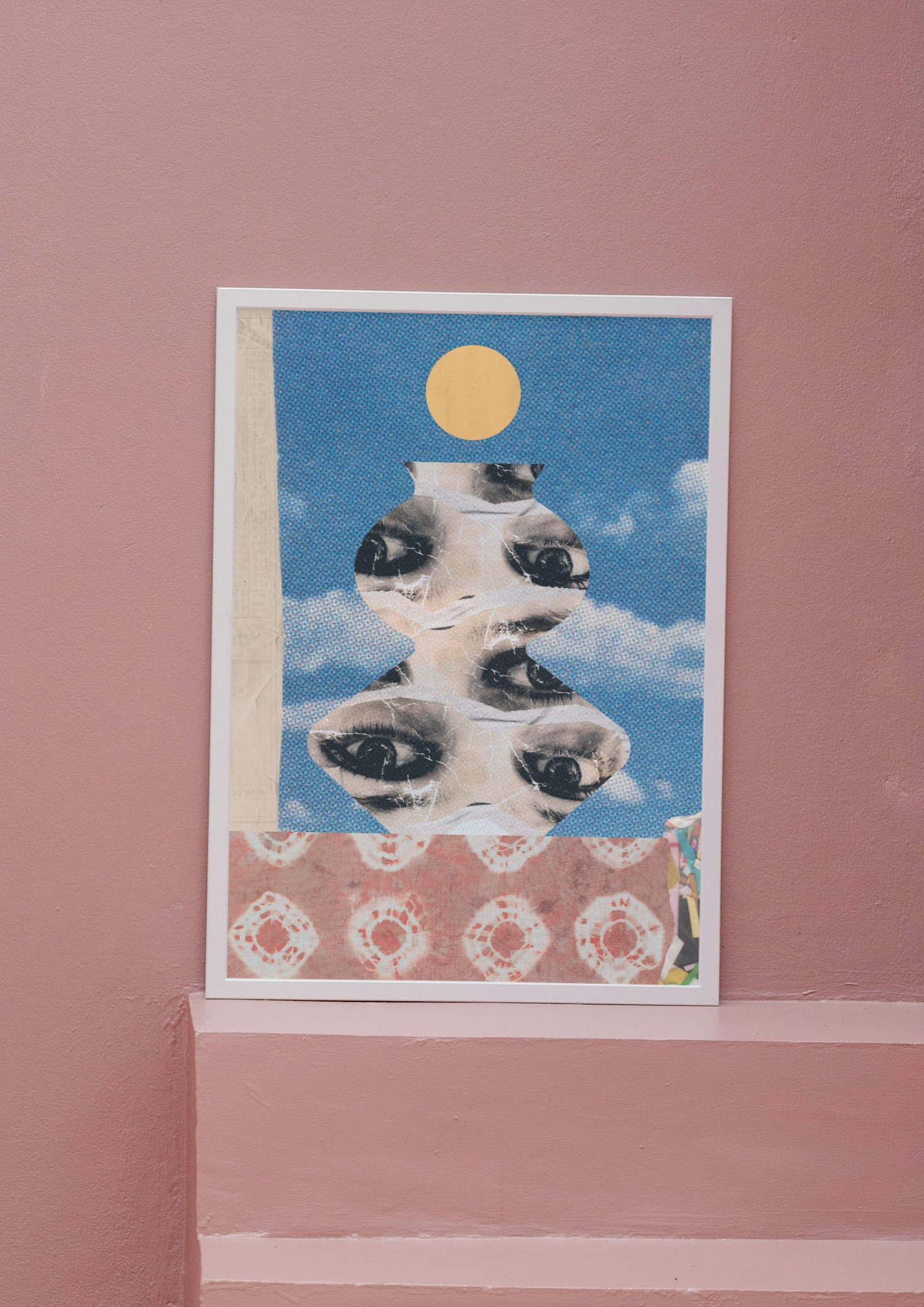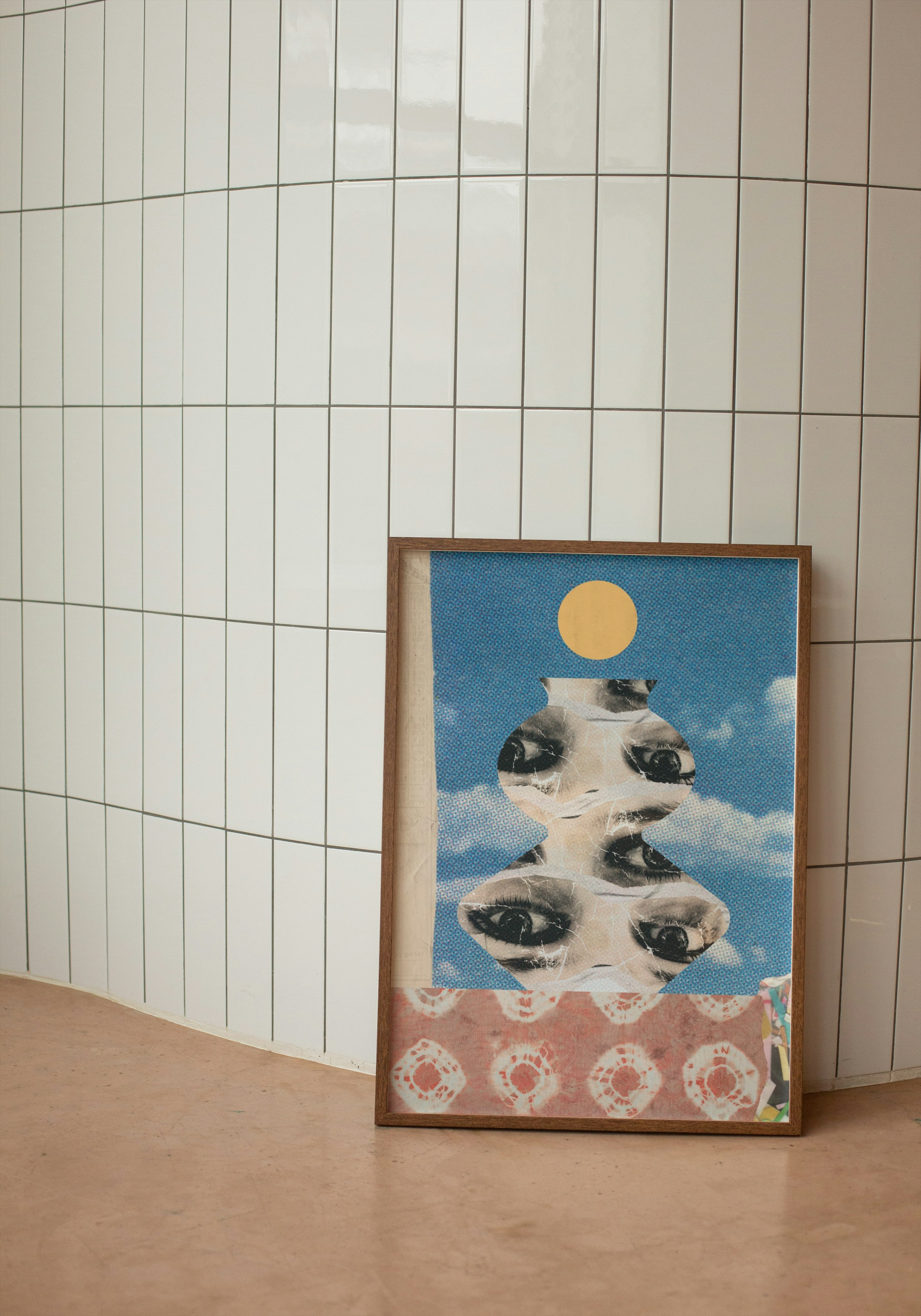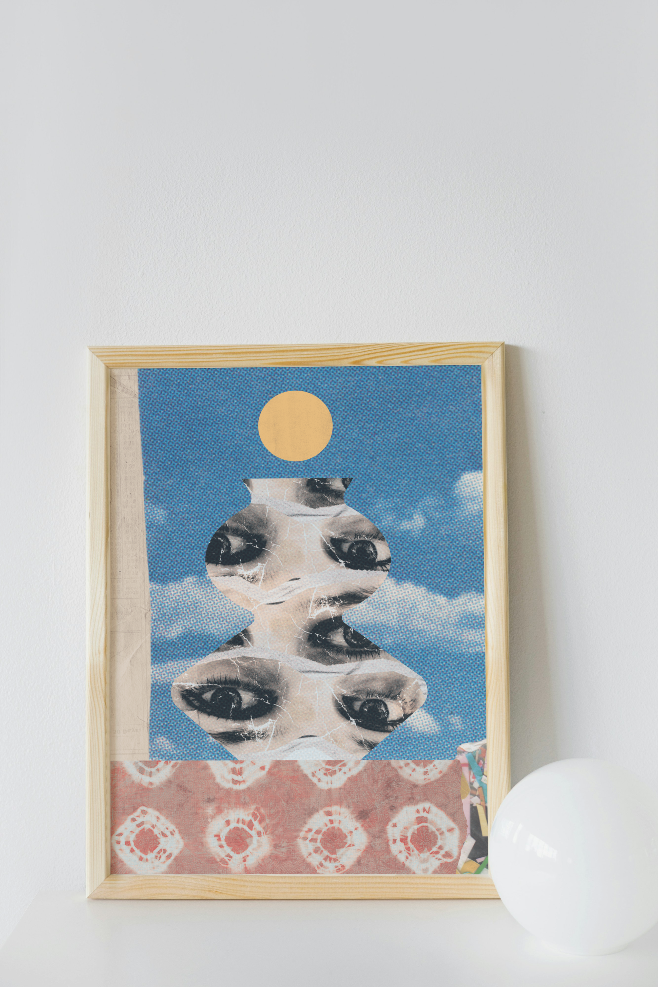 Ten plakat ma mocny, surrealistyczny klimat — kolaż z oczami, tekstura przypominająca starą grafikę, kontrast kolorów, vintage i psychodelia w jednym.