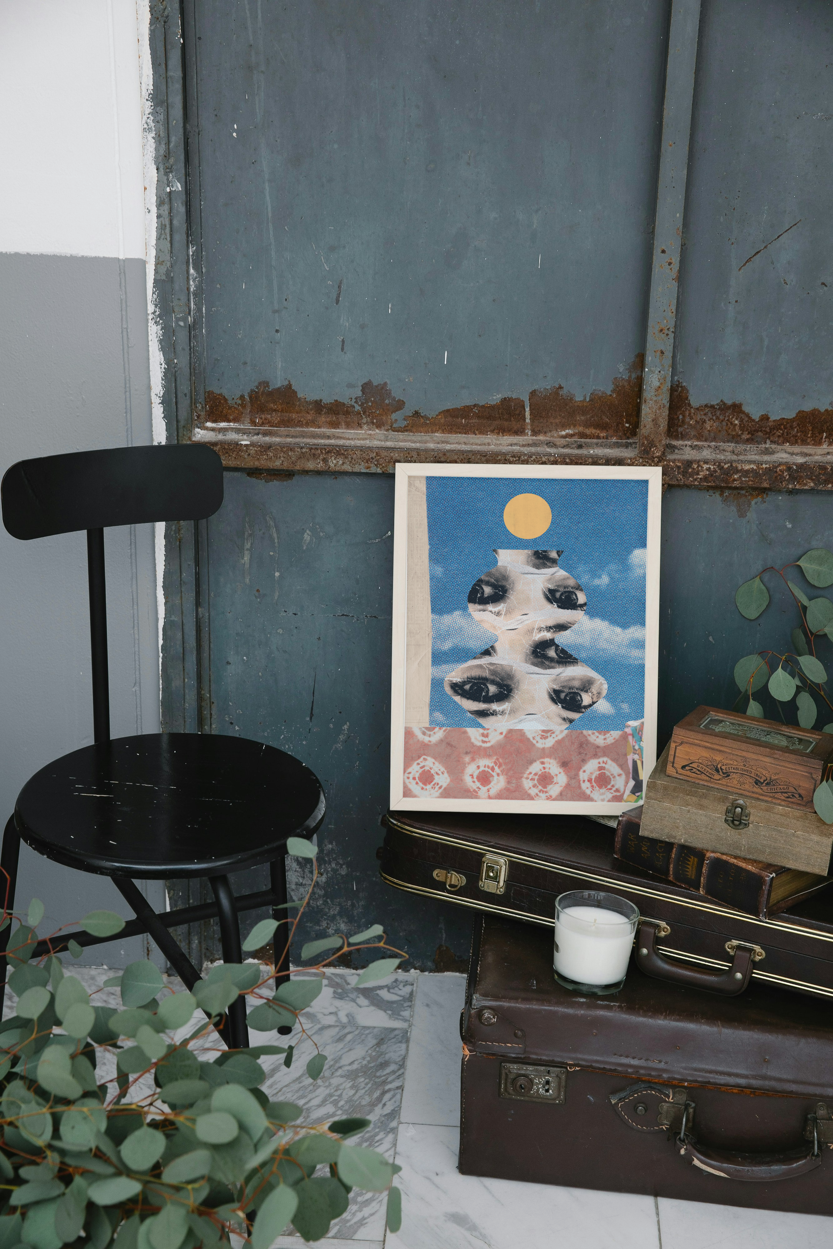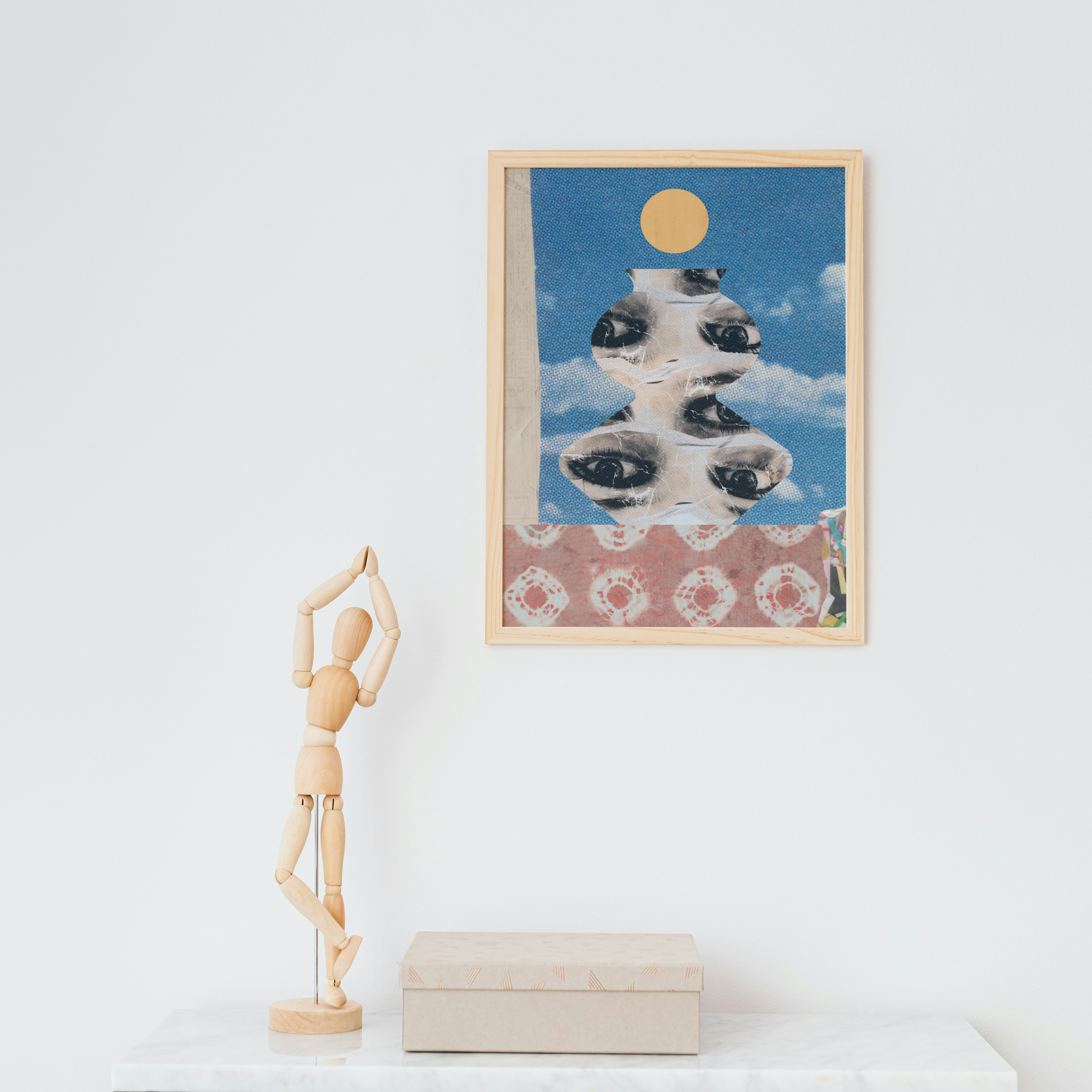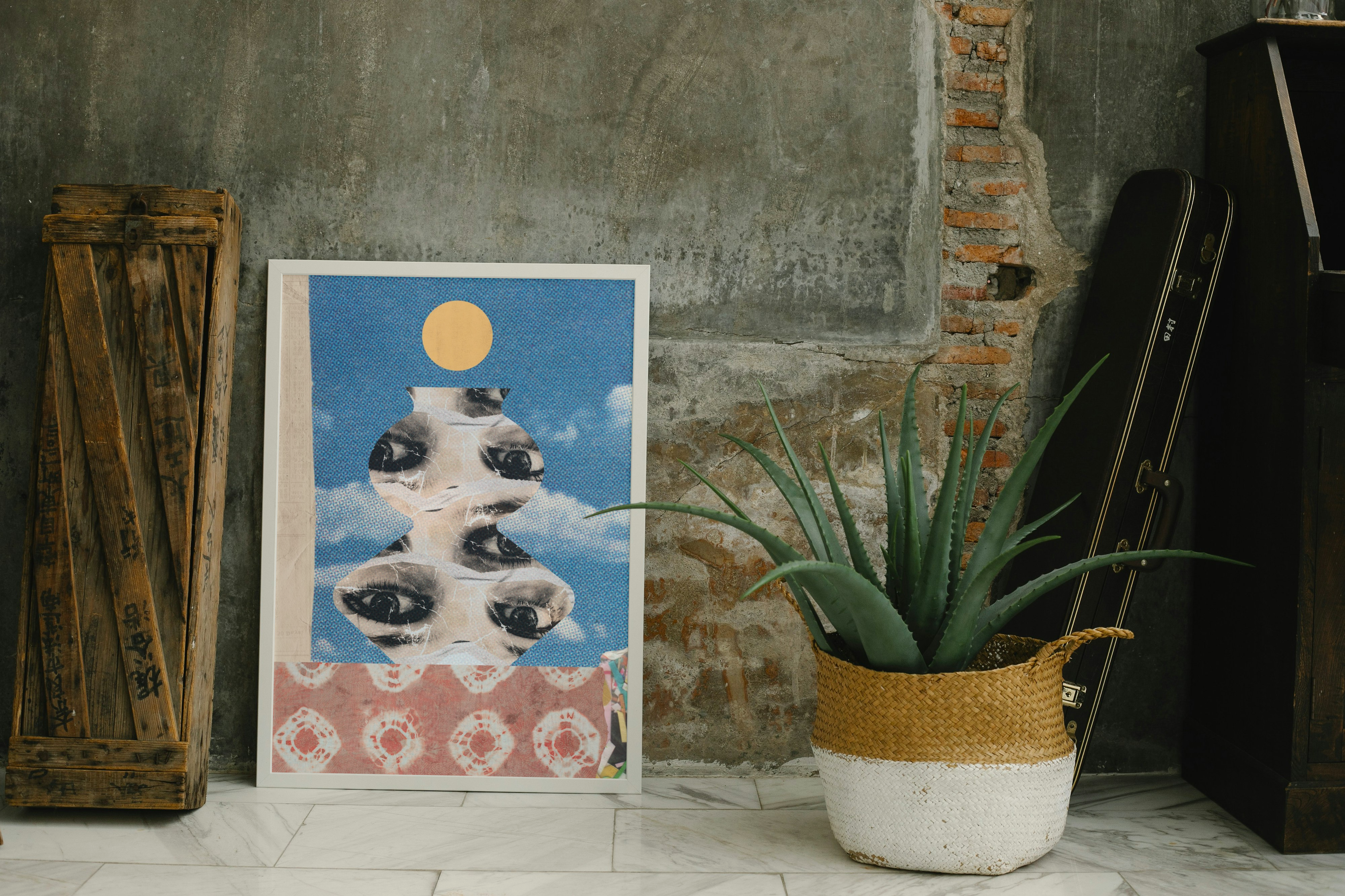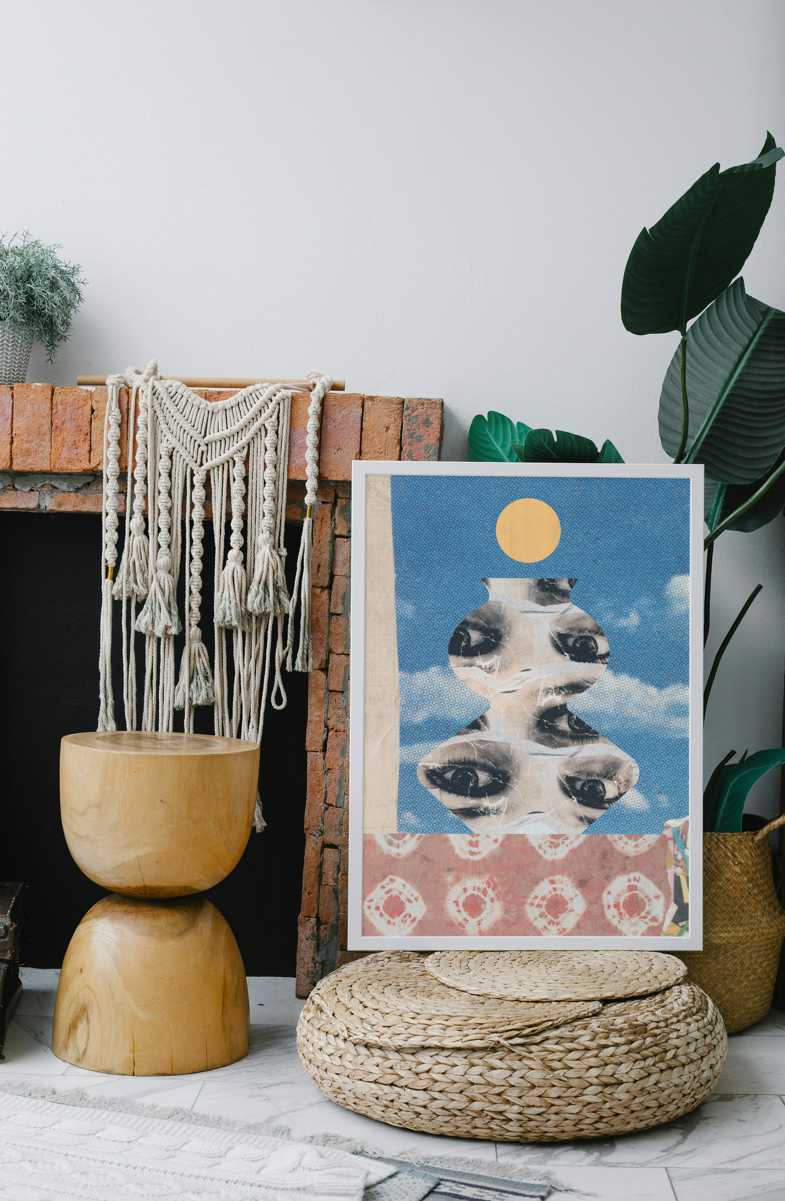 Ten plakat ma mocny, surrealistyczny klimat — kolaż z oczami, tekstura przypominająca starą grafikę, kontrast kolorów, vintage i psychodelia w jednym.